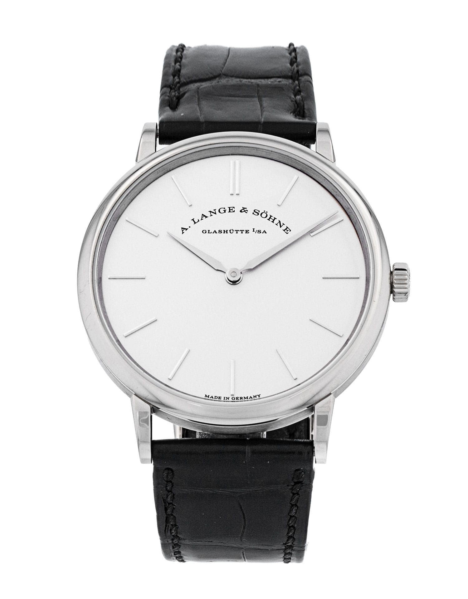 This A. Lange and Sohne Saxonia Thin 201.027 has a silver baton dial and a leather strap. This A. Lange and Sohne has undergone a thorough inspection of water resistance, accuracy, functionality and condition to determine the level of reconditioning required to meet our strict standards. It has also been referenced against technical documents and manufacturer records where available to ensure authenticity and a clean history. All our watches have a 24-month warranty for your peace of mind.