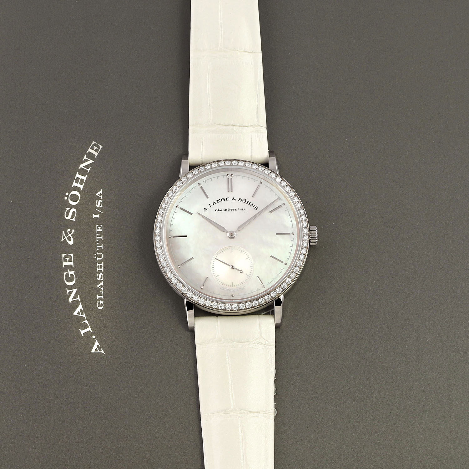 This A. Lange and Sohne Saxonia 840.029 has a mother of pearl white baton dial and a leather strap. This A. Lange and Sohne has undergone a thorough inspection of water resistance, accuracy, functionality and condition to determine the level of reconditioning required to meet our strict standards. It has also been referenced against technical documents and manufacturer records where available to ensure authenticity and a clean history. All our watches have a 24-month warranty for your peace of mind.