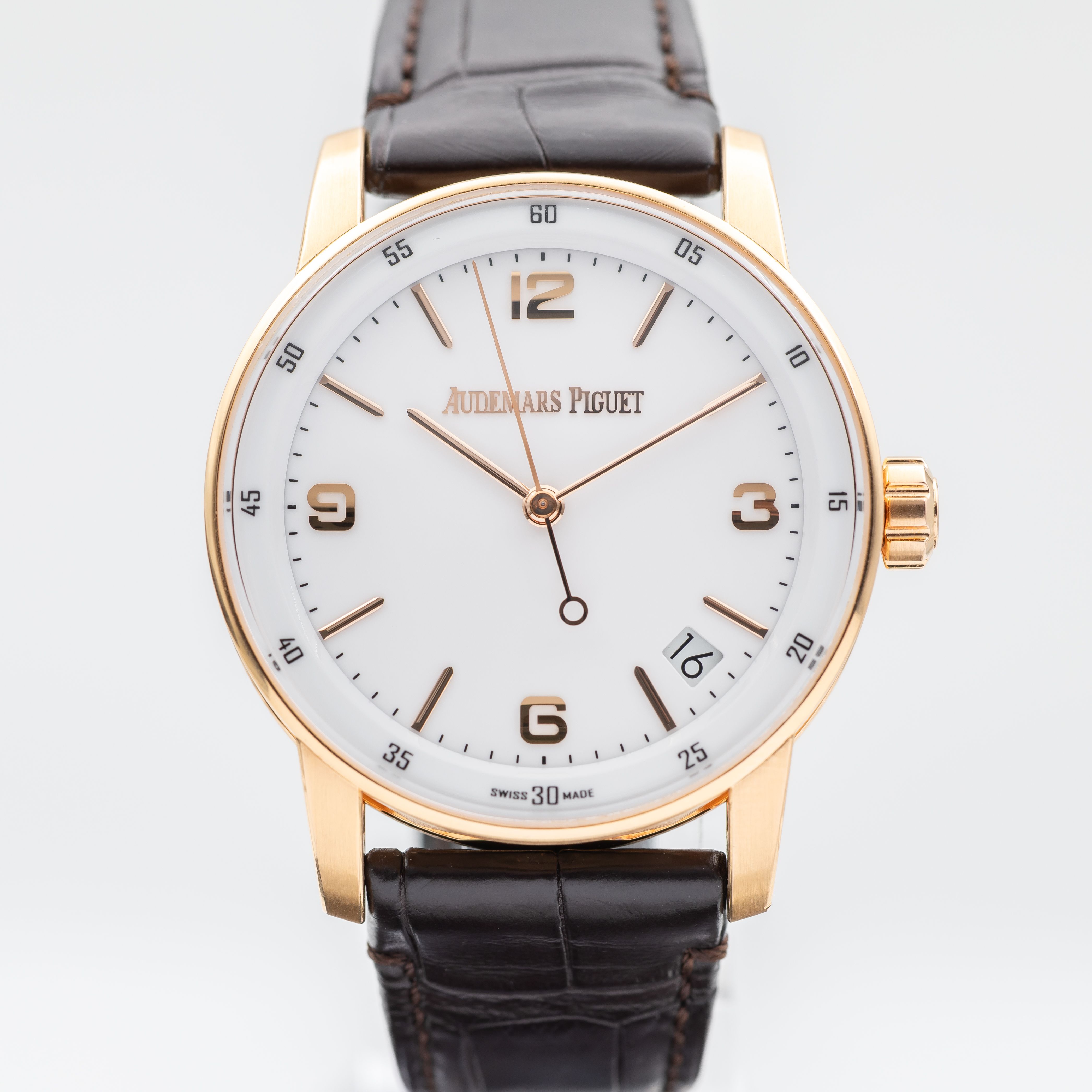 This Audemars Piguet CODE 11.59 15210OR.OO.A099CR.01 has a white quarter arabic dial and a leather strap. This Audemars Piguet has undergone a thorough inspection of accuracy, functionality and condition at our Audemars Piguet certified service centre to determine the level of reconditioning required to meet our strict standards. It has also been checked against our records to ensure authenticity. All our watches have a 24-month warranty for your peace of mind.