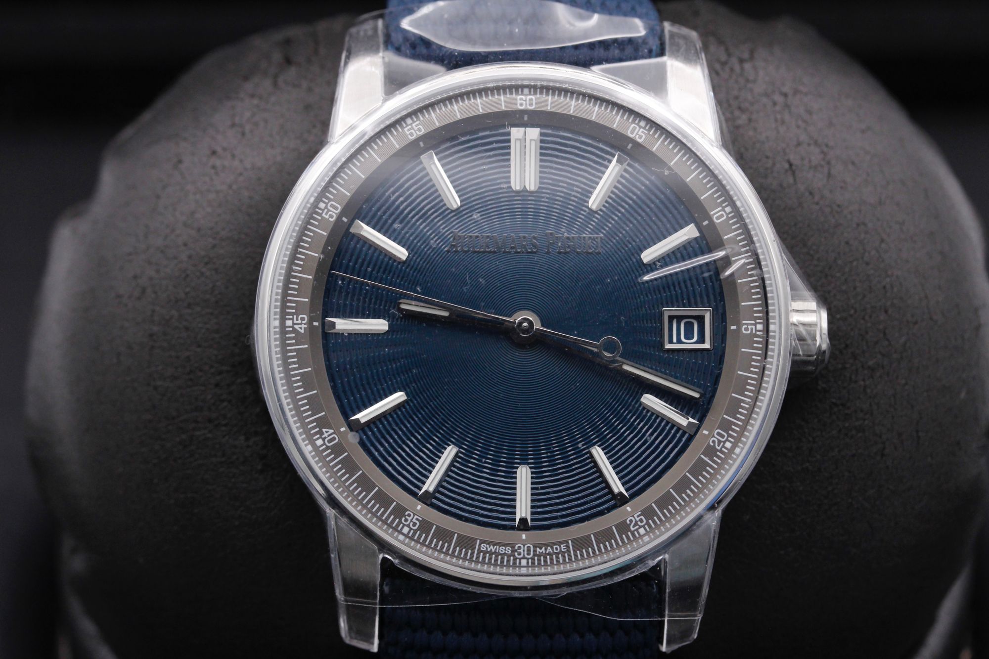 This Audemars Piguet CODE 11.59 15210ST.OO.A348KB.01 has a blue baton dial and a fabric strap. This Audemars Piguet has undergone a thorough inspection of accuracy, functionality and condition at our Audemars Piguet certified service centre to determine the level of reconditioning required to meet our strict standards. It has also been checked against our records to ensure authenticity. All our watches have a 24-month warranty for your peace of mind.