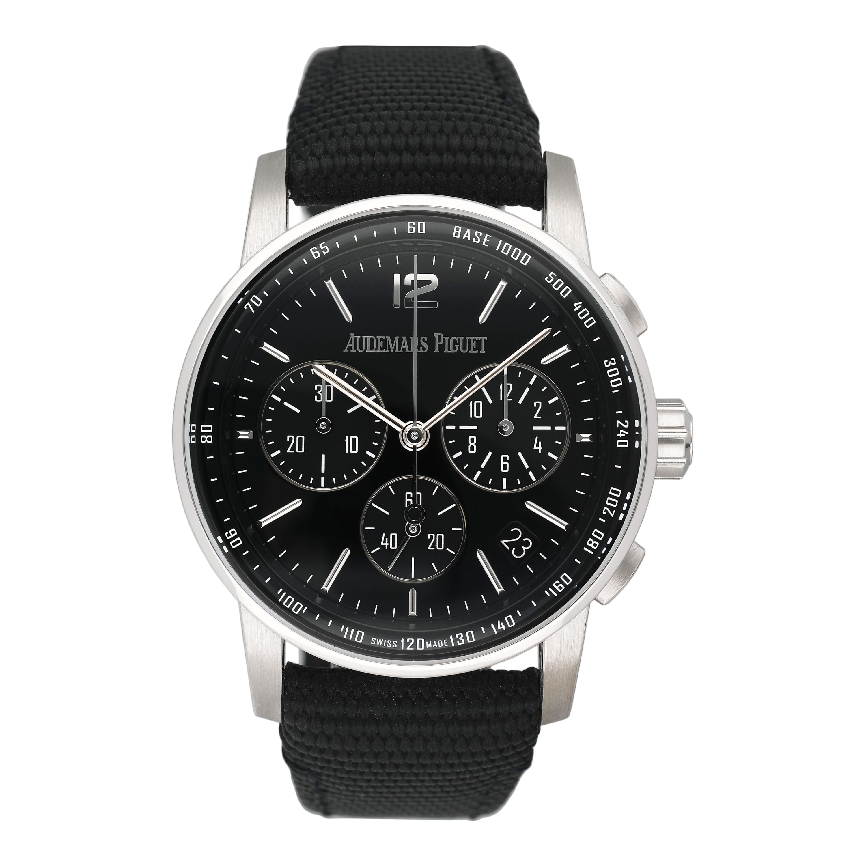 This Audemars Piguet CODE 11.59 26393BC.OO.A002CR.01 has a black baton dial and a fabric strap. This Audemars Piguet has undergone a thorough inspection of accuracy, functionality and condition at our Audemars Piguet certified service centre to determine the level of reconditioning required to meet our strict standards. It has also been checked against our records to ensure authenticity. All our watches have a 24-month warranty for your peace of mind.