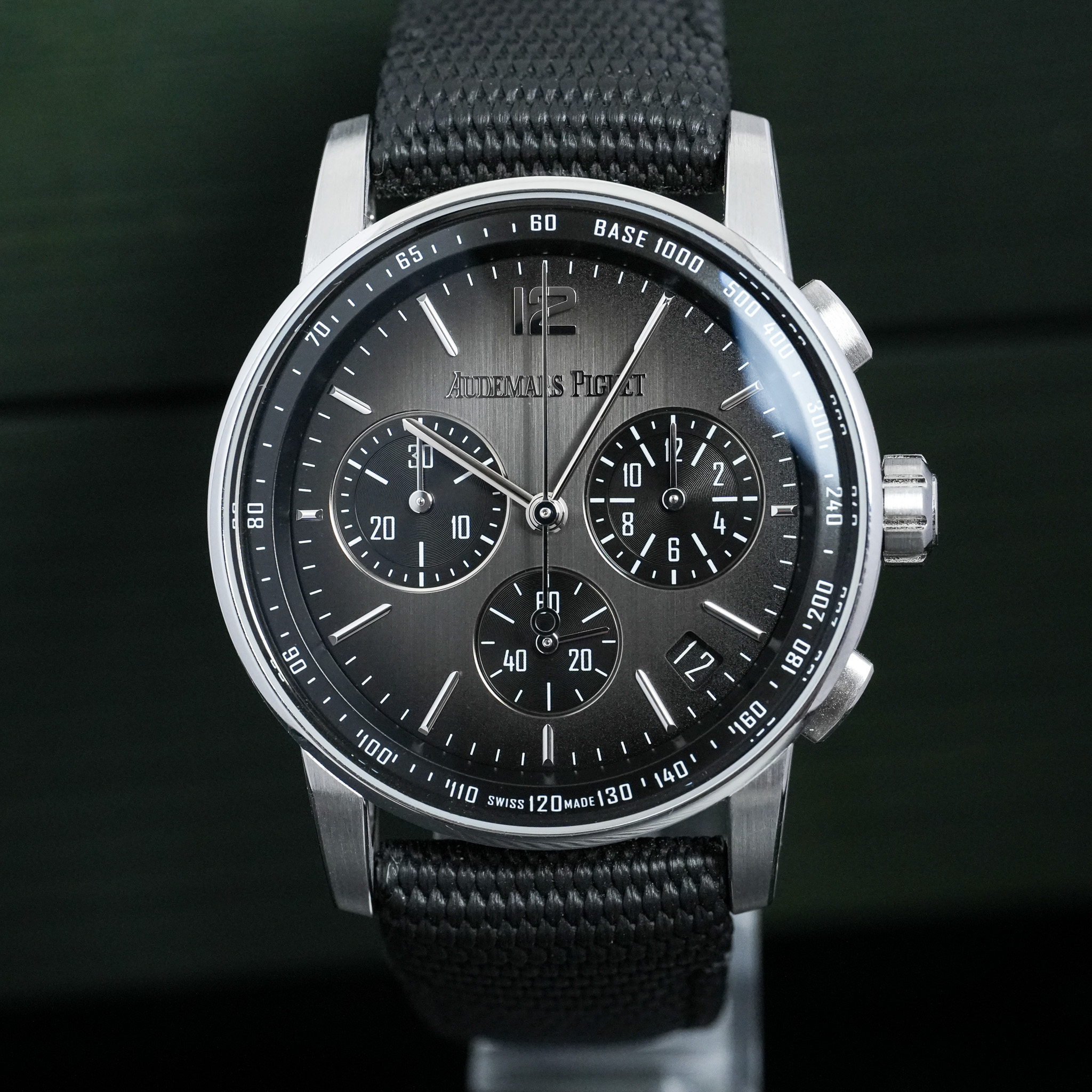 This Audemars Piguet CODE 11.59 26393NB.OO.A002KB.01 has a dark grey baton dial and a fabric strap. This Audemars Piguet has undergone a thorough inspection of accuracy, functionality and condition at our Audemars Piguet certified service centre to determine the level of reconditioning required to meet our strict standards. It has also been checked against our records to ensure authenticity. Our watches have a 24-month warranty for your peace of mind, in conjunction with any remaining manufacturer’s warranty from new or from service.