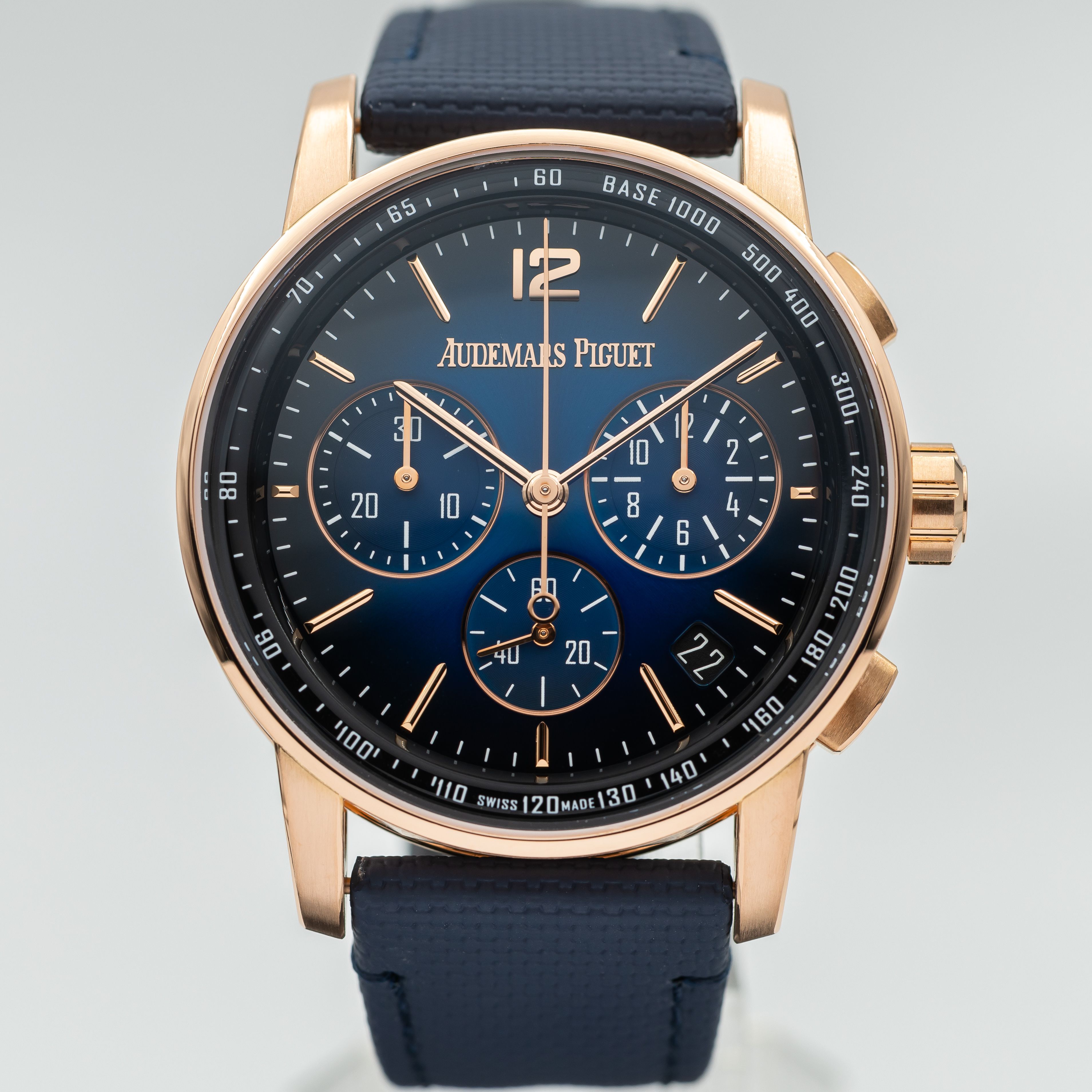 This Audemars Piguet CODE 11.59 26393OR.OO.A002KB.03 has a blue dial and a fabric strap. This Audemars Piguet has undergone a thorough inspection of accuracy, functionality and condition at our Audemars Piguet certified service centre to determine the level of reconditioning required to meet our strict standards. It has also been checked against our records to ensure authenticity. Our watches have a 24-month warranty for your peace of mind, in conjunction with any remaining manufacturer’s warranty from new or from service.