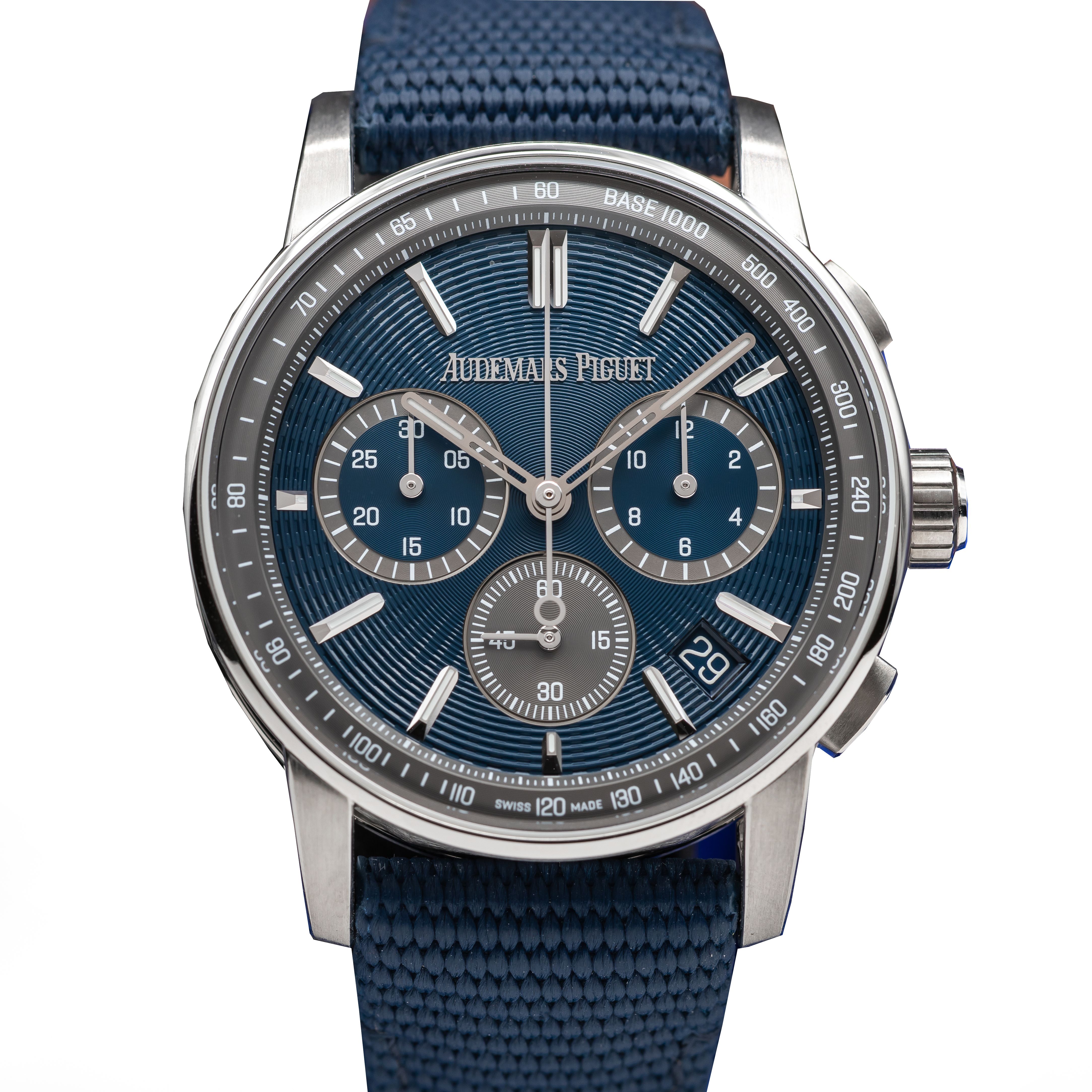 This Audemars Piguet CODE 11.59 26393ST.OO.A348KB.01 has a blue dial and a fabric strap. This Audemars Piguet has undergone a thorough inspection of accuracy, functionality and condition at our Audemars Piguet certified service centre to determine the level of reconditioning required to meet our strict standards. It has also been checked against our records to ensure authenticity. Our watches have a 24-month warranty for your peace of mind, in conjunction with any remaining manufacturer’s warranty from new or from service.