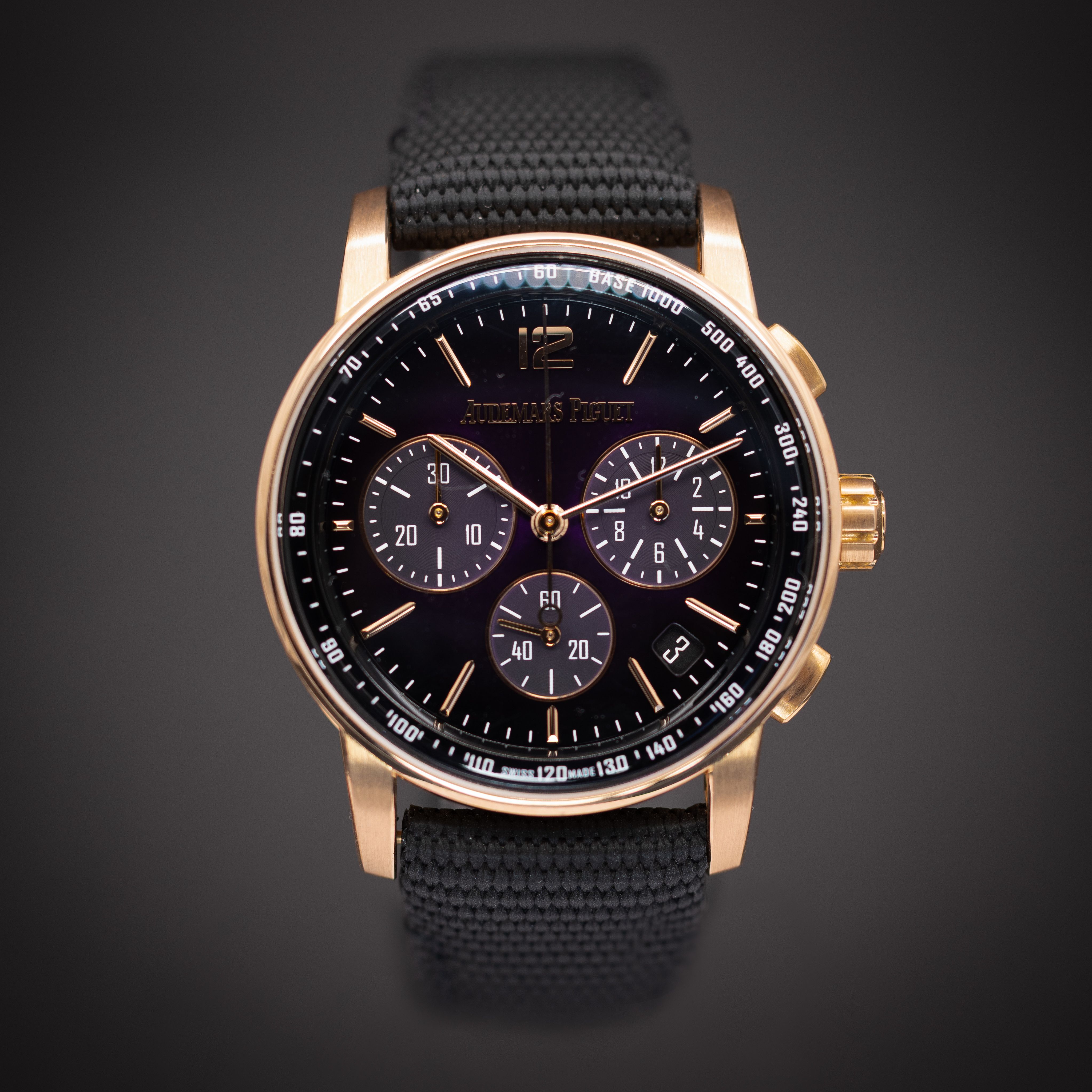 This Audemars Piguet CODE 11.59 26393OR.OO.A002KB.02 has a purple dial and a fabric strap. This Audemars Piguet has undergone a thorough inspection of accuracy, functionality and condition at our Audemars Piguet certified service centre to determine the level of reconditioning required to meet our strict standards. It has also been checked against our records to ensure authenticity. Our watches have a 24-month warranty for your peace of mind, in conjunction with any remaining manufacturer’s warranty from new or from service.