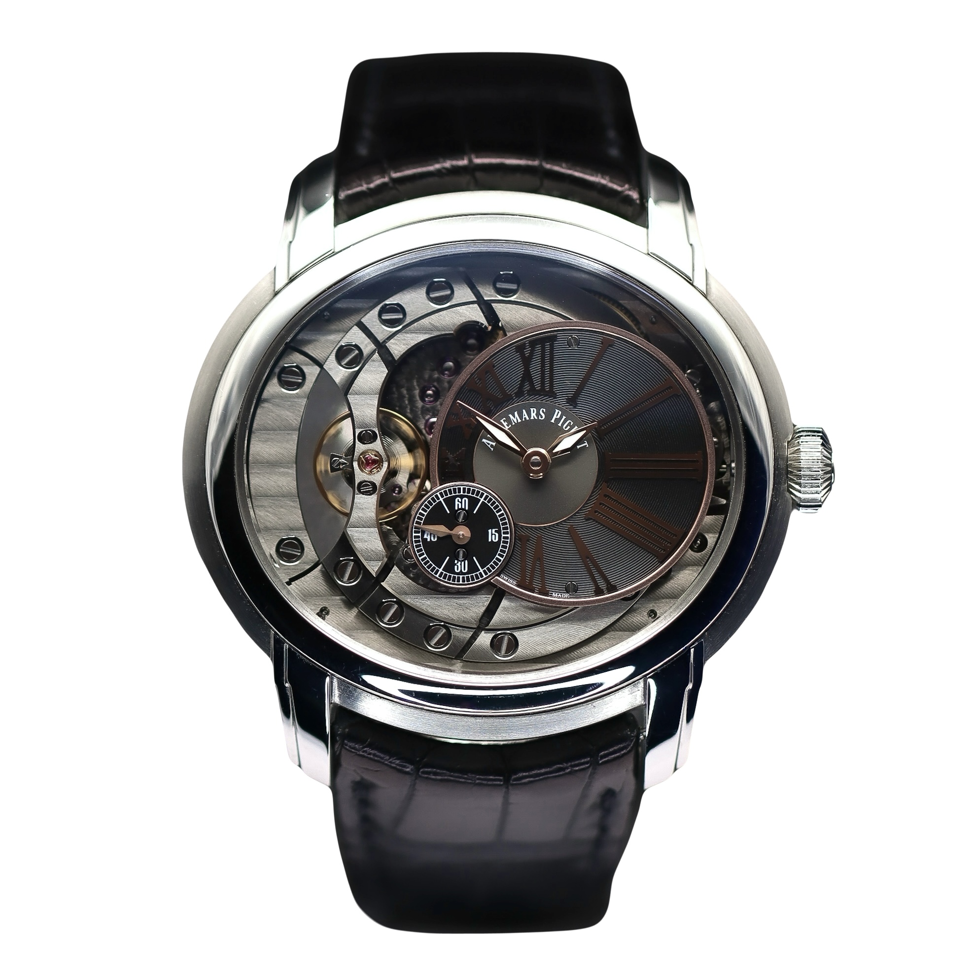 This Audemars Piguet Millenary 15350ST.OO.D002CR.01 has a skeleton dial and a leather strap. This Audemars Piguet has undergone a thorough inspection of accuracy, functionality and condition at our Audemars Piguet certified service centre to determine the level of reconditioning required to meet our strict standards. It has also been checked against our records to ensure authenticity. All our watches have a 24-month warranty for your peace of mind.