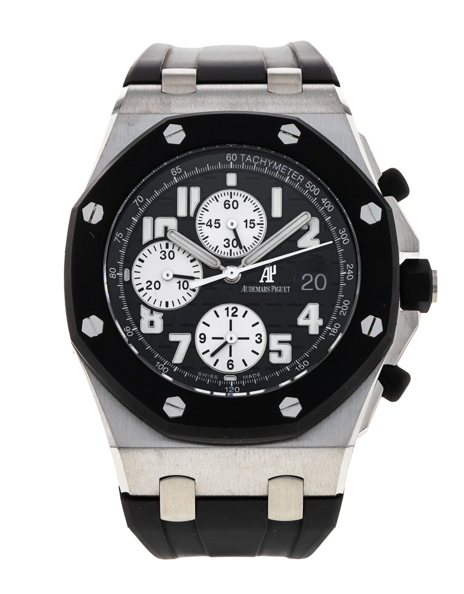 The Audemars Piguet Royal Oak Offshore, first introduced in 1993 and designed by Emmanuel Gueit, takes the bold nature of the Royal Oak to the next level. It's the brand's sportiest collection, featuring large case sizes, striking or exaggerated designs, and innovative use of materials – such as the extraordinary rubber bezel here. Often described as “larger-than-life”, the Offshore can be aesthetically bold, with dramatic design cues that exaggerate and heighten those of its predecessor. The watch is an evolution of the original Royal Oak, pioneered by the legendary Gerald Genta in 1972. His groundbreaking design proved to be the brand's saving grace at a time when it was suffering the economic aftermath of the Depression and the onset of the quartz crisis.