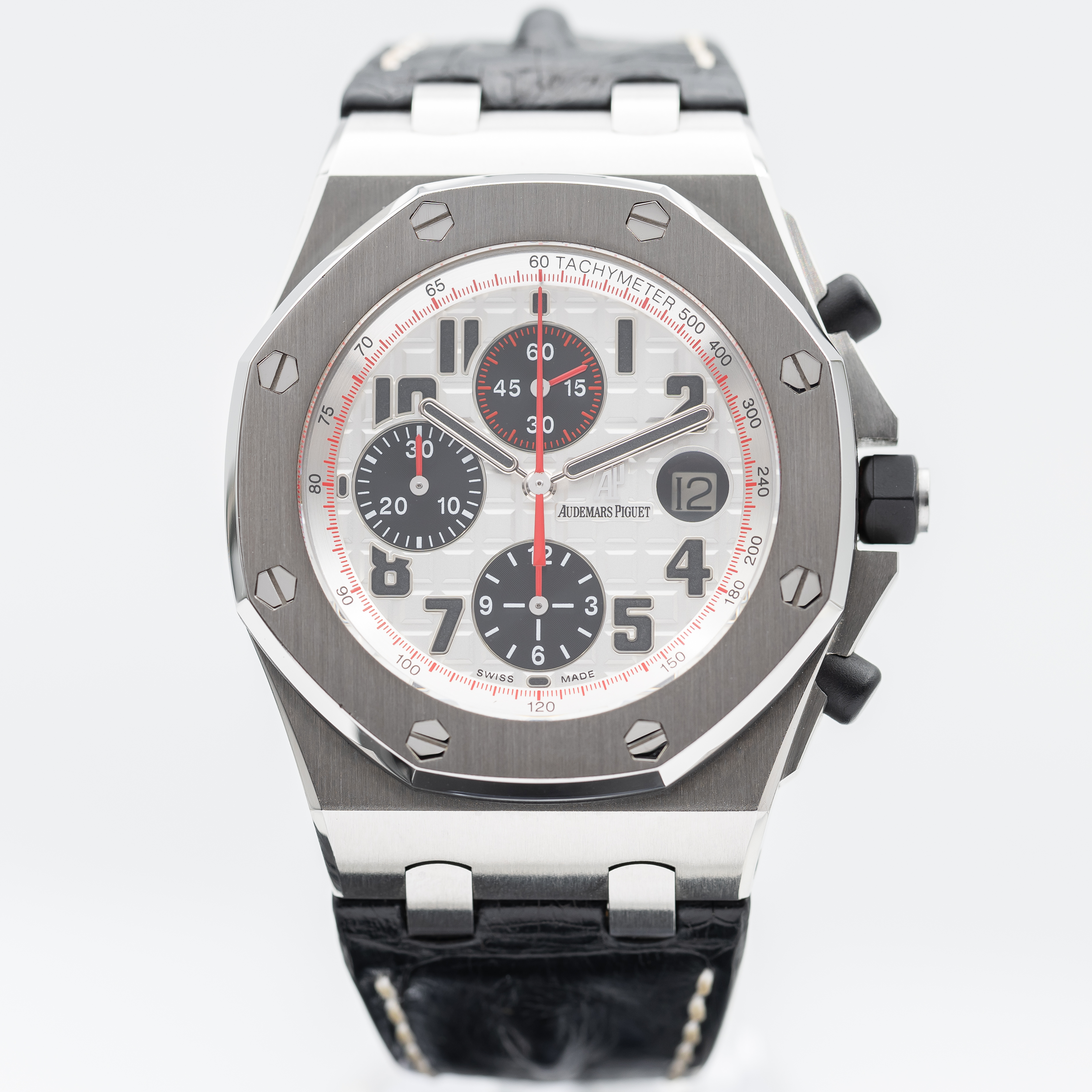 This Audemars Piguet Royal Oak Offshore 26170ST.OO.D101CR.02 has a silver arabic dial and a leather strap. This Audemars Piguet has undergone a thorough inspection of accuracy, functionality and condition at our Audemars Piguet certified service centre to determine the level of reconditioning required to meet our strict standards. It has also been checked against our records to ensure authenticity. All our watches have a 24-month warranty for your peace of mind.