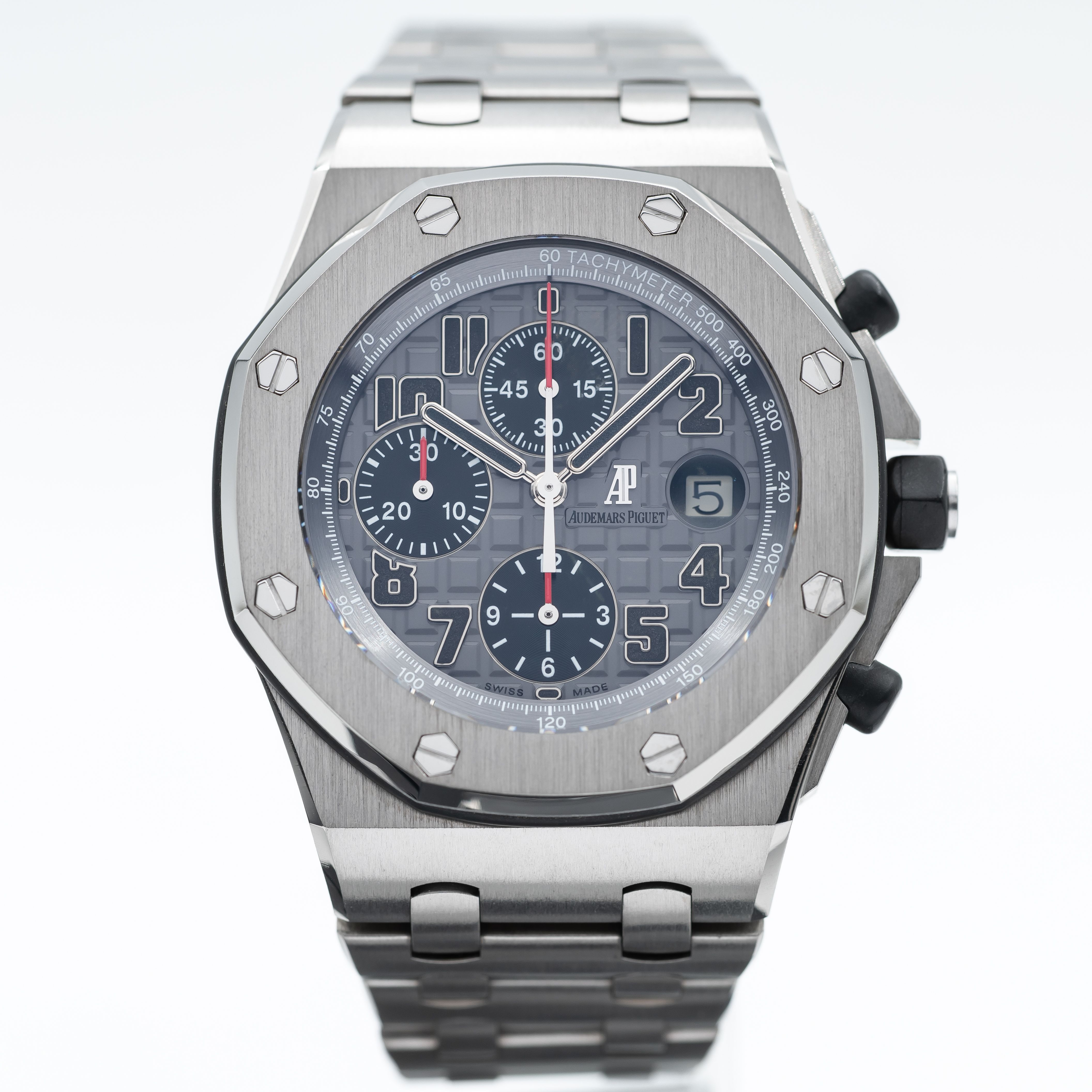 This Audemars Piguet Royal Oak Offshore 26170TI.OO.1000TI.01 has a anthracite dial and a bracelet strap. This Audemars Piguet has undergone a thorough inspection of accuracy, functionality and condition at our Audemars Piguet certified service centre to determine the level of reconditioning required to meet our strict standards. It has also been checked against our records to ensure authenticity. All our watches have a 24-month warranty for your peace of mind.