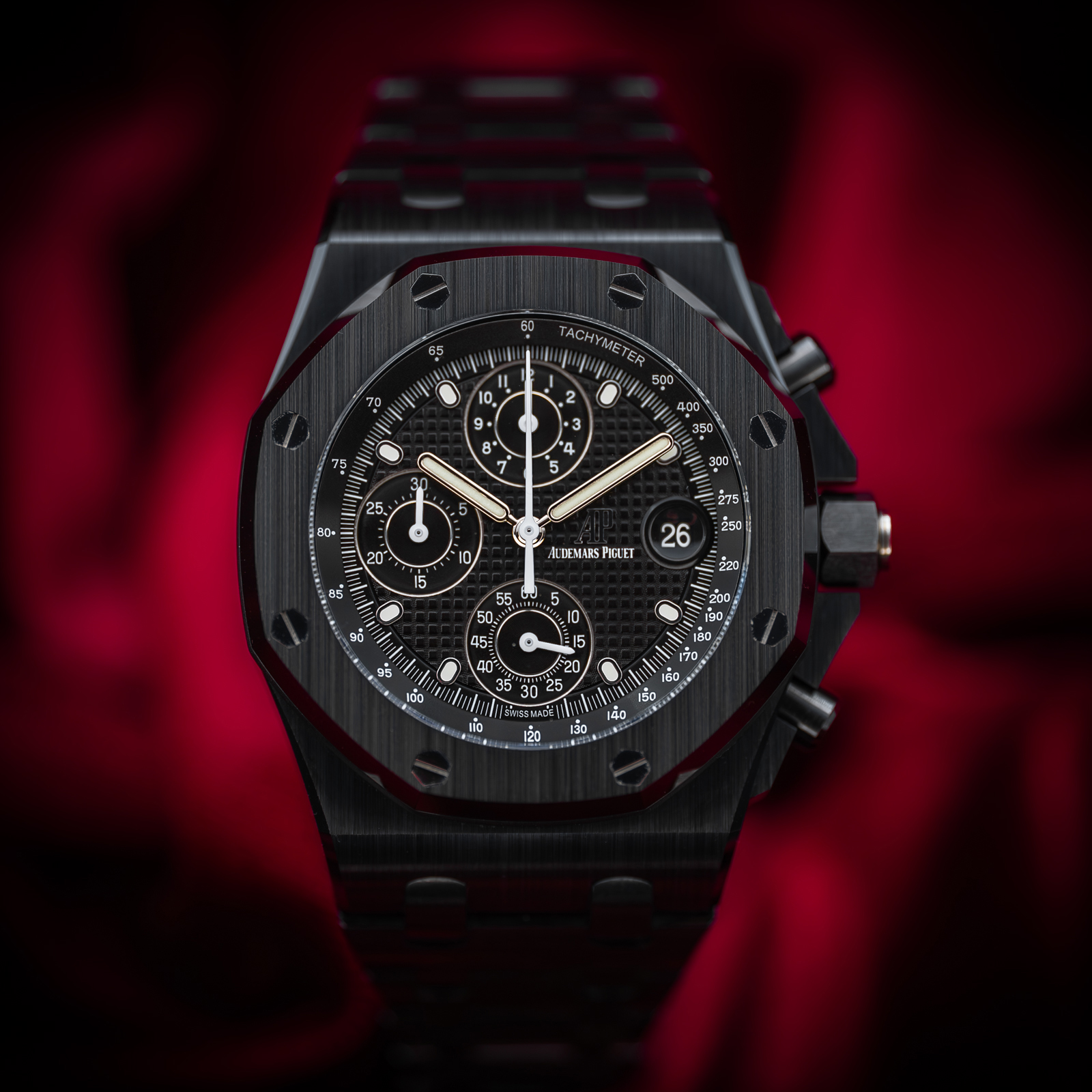 This Audemars Piguet Royal Oak Offshore 26238CE.OO.1300CE.01 has a black dial and a bracelet strap. This Audemars Piguet has undergone a thorough inspection of accuracy, functionality and condition at our Audemars Piguet certified service centre to determine the level of reconditioning required to meet our strict standards. It has also been checked against our records to ensure authenticity. Our watches have a 24-month warranty for your peace of mind, in conjunction with any remaining manufacturer’s warranty from new or from service.