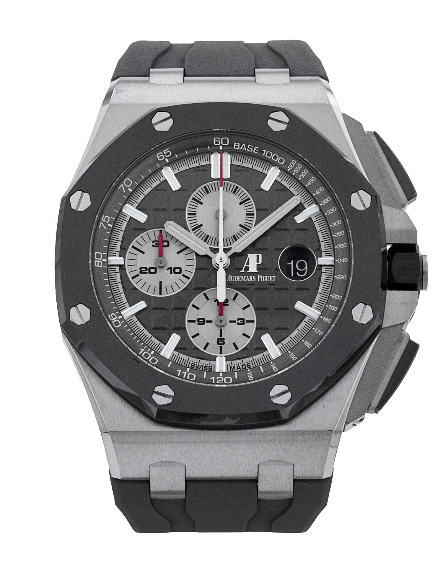 This Audemars Piguet Royal Oak Offshore 26400IO.OO.A004CA.01 has a grey dial and a rubber strap. This Audemars Piguet has undergone a thorough inspection of accuracy, functionality and condition at our Audemars Piguet certified service centre to determine the level of reconditioning required to meet our strict standards. It has also been checked against our records to ensure authenticity. Our watches have a 24-month warranty for your peace of mind, in conjunction with any remaining manufacturer’s warranty from new or from service.
