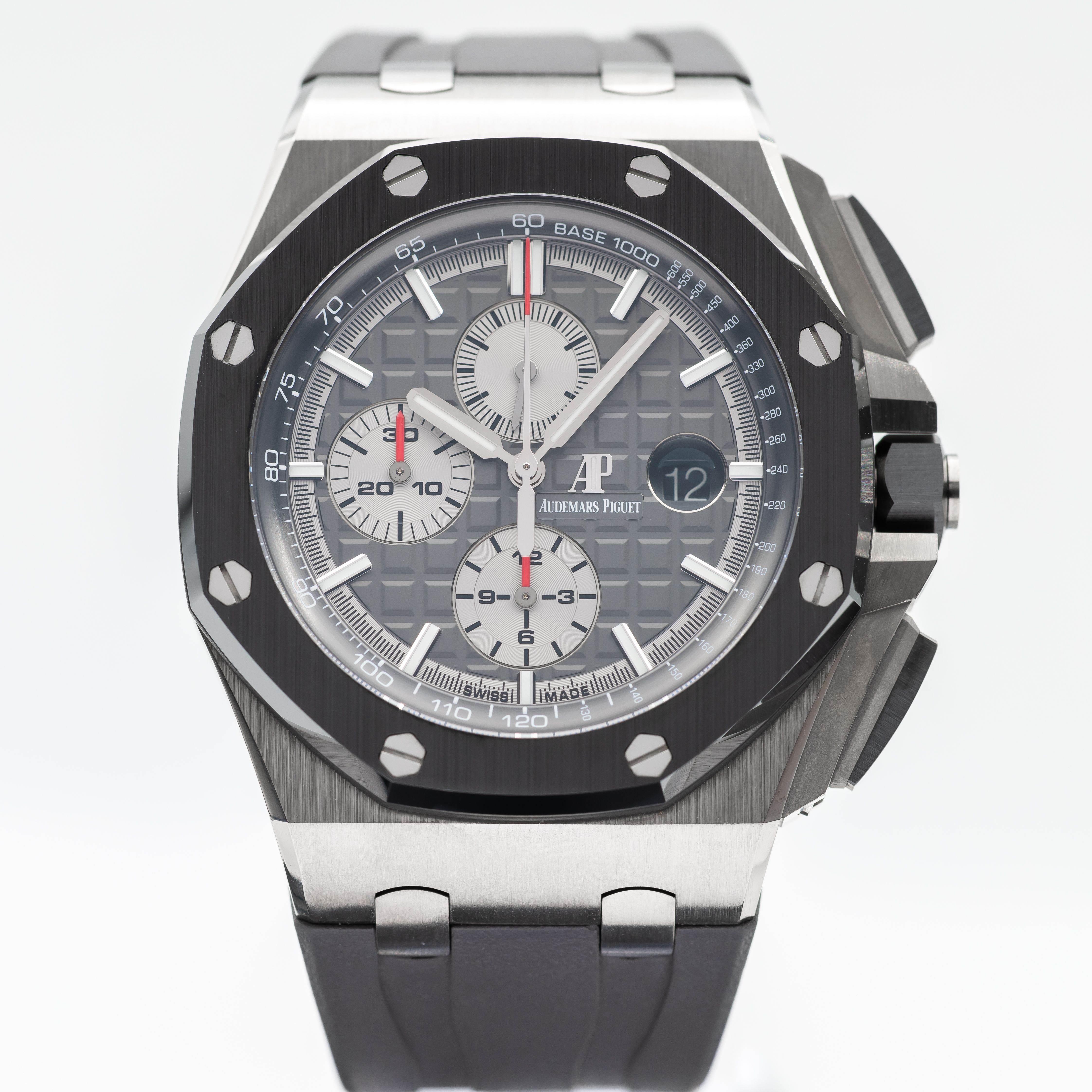 This Audemars Piguet Royal Oak Offshore 26400IO.OO.A004CA.01 has a grey dial and a rubber strap. This Audemars Piguet has undergone a thorough inspection of accuracy, functionality and condition at our Audemars Piguet certified service centre to determine the level of reconditioning required to meet our strict standards. It has also been checked against our records to ensure authenticity. All our watches have a 24-month warranty for your peace of mind.
