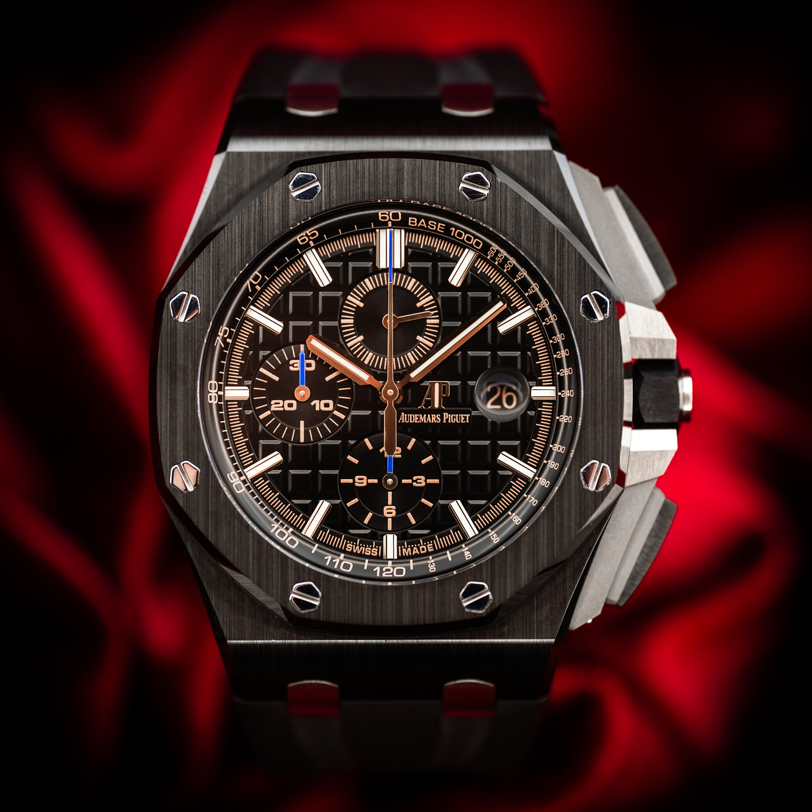 This Audemars Piguet Royal Oak Offshore 26405CE.OO.A002CA.02 has a black & rose gold dial and a rubber strap. This Audemars Piguet has undergone a thorough inspection of accuracy, functionality and condition at our Audemars Piguet certified service centre to determine the level of reconditioning required to meet our strict standards. It has also been checked against our records to ensure authenticity. All our watches have a 24-month warranty for your peace of mind.