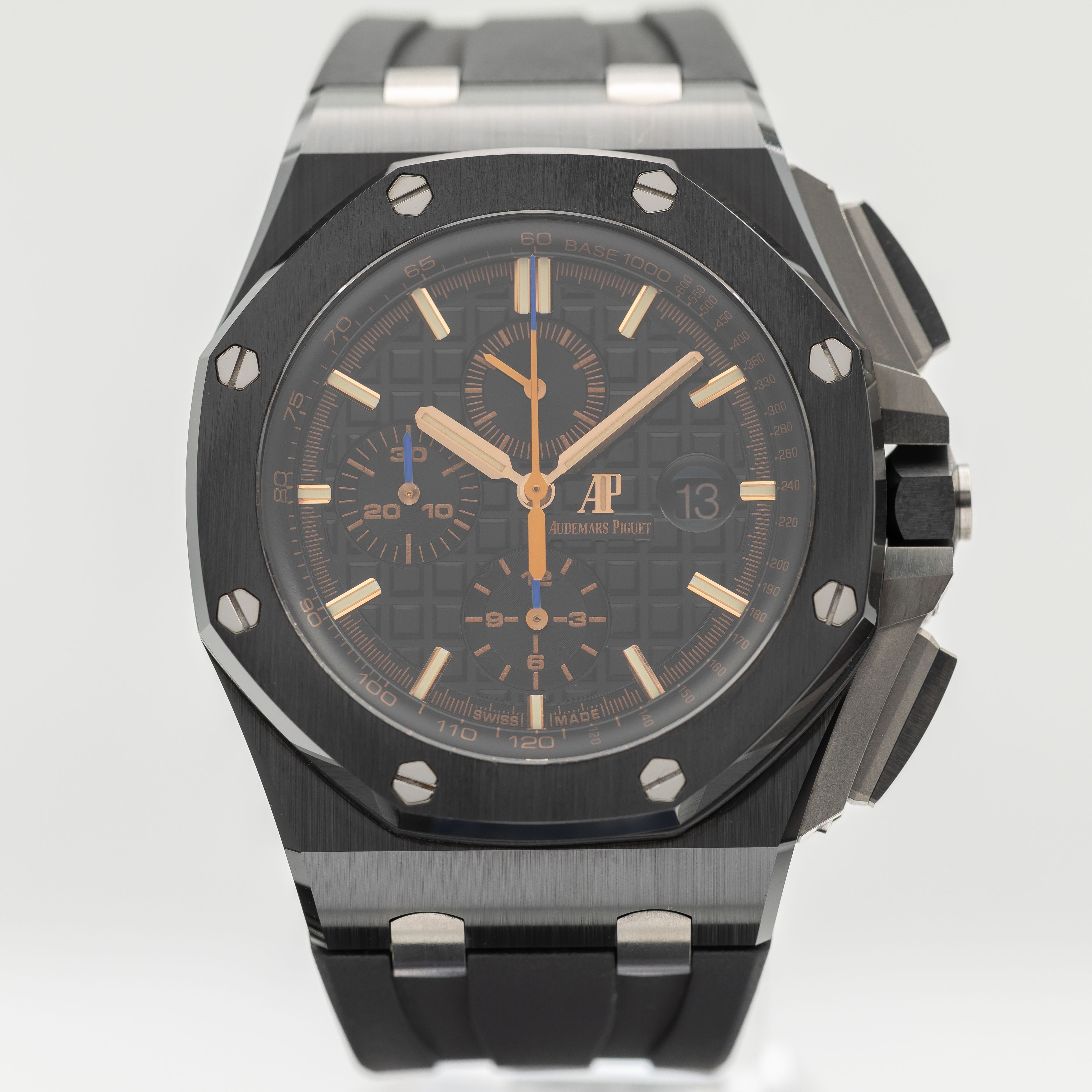 This Audemars Piguet Royal Oak Offshore 26405CE.OO.A002CA.02 has a black & rose gold dial and a rubber strap. This Audemars Piguet has undergone a thorough inspection of accuracy, functionality and condition at our Audemars Piguet certified service centre to determine the level of reconditioning required to meet our strict standards. It has also been checked against our records to ensure authenticity. All our watches have a 24-month warranty for your peace of mind.