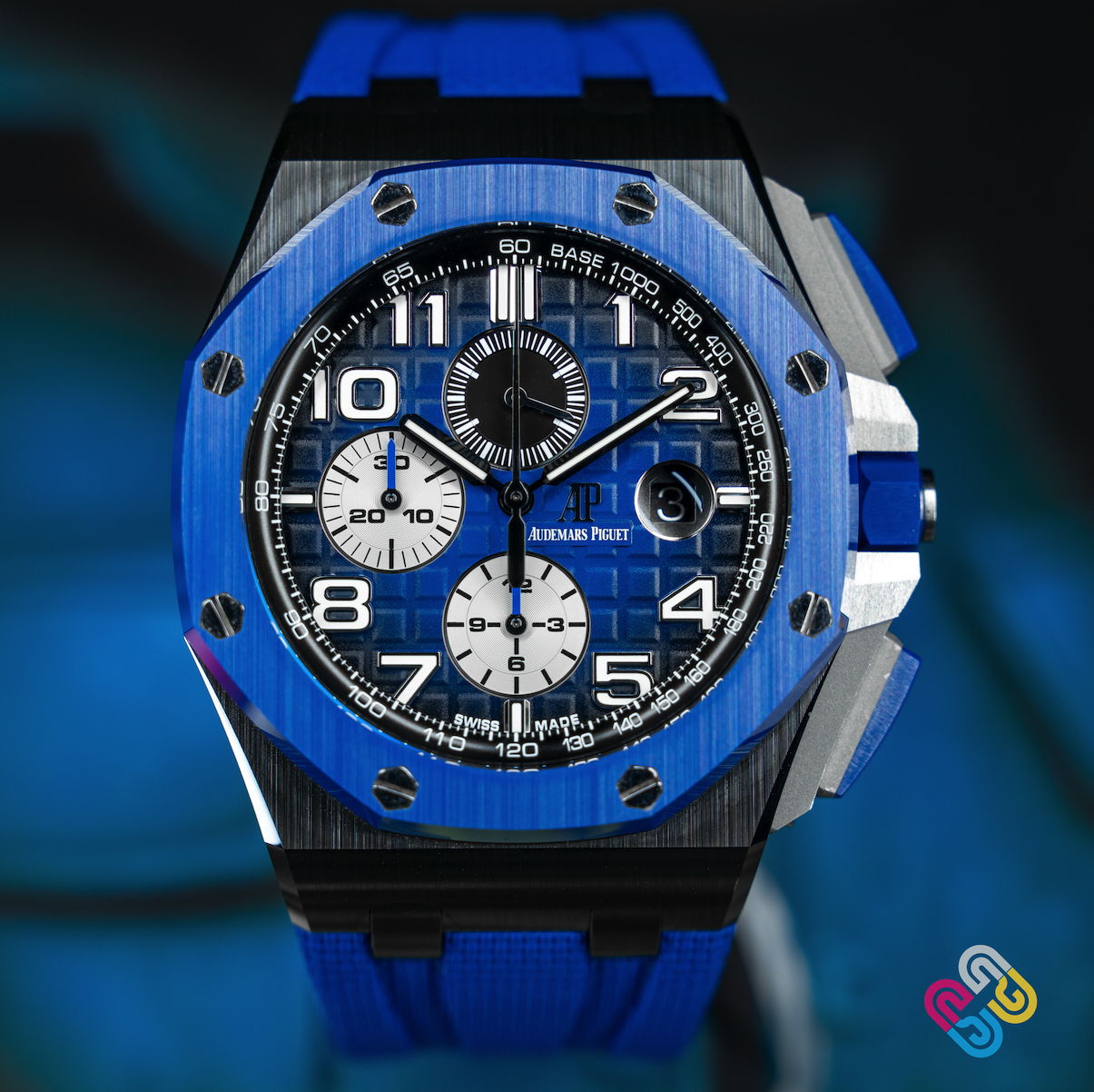 This Audemars Piguet Royal Oak Offshore 26405CE.OO.A030CA.01 has a blue arabic dial and a fabric strap. This Audemars Piguet has undergone a thorough inspection of accuracy, functionality and condition at our Audemars Piguet certified service centre to determine the level of reconditioning required to meet our strict standards. It has also been checked against our records to ensure authenticity. All our watches have a 24-month warranty for your peace of mind.