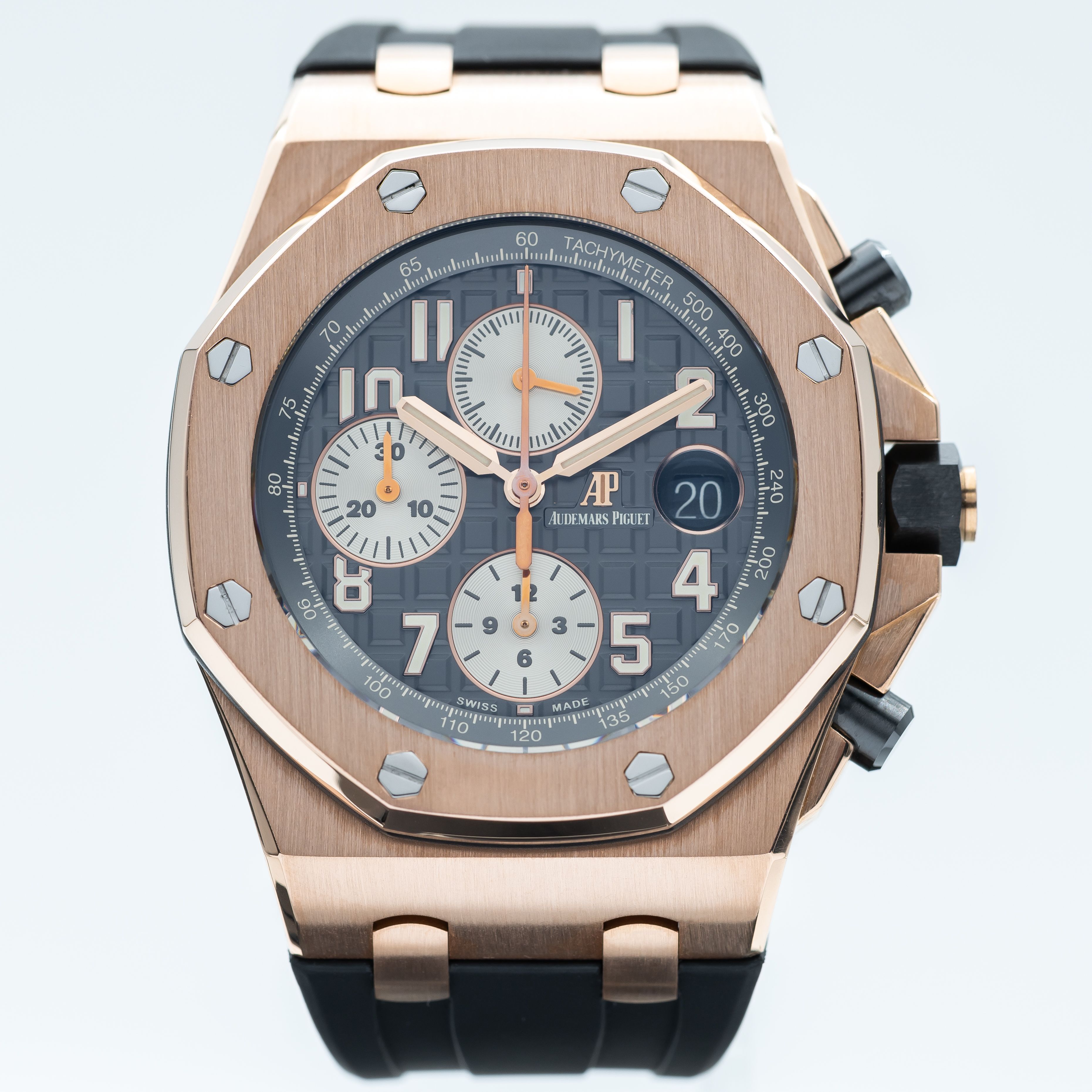 This Audemars Piguet Royal Oak Offshore 26470OR.OO.A125CR.01 has a grey arabic dial and a rubber strap. This Audemars Piguet has undergone a thorough inspection of accuracy, functionality and condition at our Audemars Piguet certified service centre to determine the level of reconditioning required to meet our strict standards. It has also been checked against our records to ensure authenticity. All our watches have a 24-month warranty for your peace of mind.