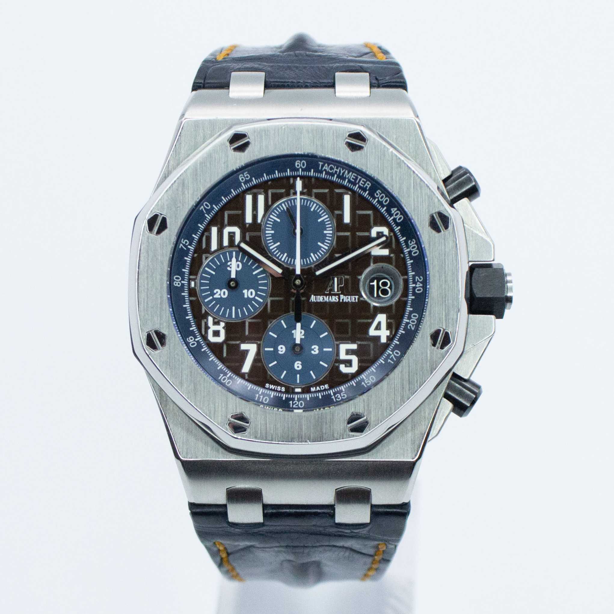 Designed by Emmanuelle Gueit to celebrate twenty years since the 1972 release of its now-iconic older brother, the Royal Oak, the Offshore range of watches is said to have influenced the trend for oversized watches that began in the mid 1990s. Similar to its forebear, which was designed by Gerald Genta, the Royal Oak Offshore is bigger and bolder, often paired with tough rubber straps. This particular model features an unusual chocolate brown tapisserie dial paired with blue sub-dials—a truly stunning combination that is complemented by the brown alligator strap. Although the 42mm case is steel, white gold was used for the hour and minutes hands, as well as the rims of the Arabic luminescent numerals. This watch runs on an AP caliber 3126/3840 automatic movement which holds a power reserve of approximately 50 hours.