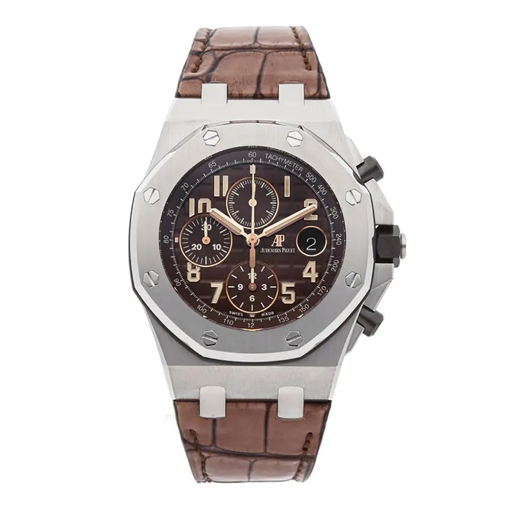 This Audemars Piguet Royal Oak Offshore 26470ST.OO.A820CR.01 has a brown arabic dial and a leather strap. This Audemars Piguet has undergone a thorough inspection of accuracy, functionality and condition at our Audemars Piguet certified service centre to determine the level of reconditioning required to meet our strict standards. It has also been checked against our records to ensure authenticity. All our watches have a 24-month warranty for your peace of mind.