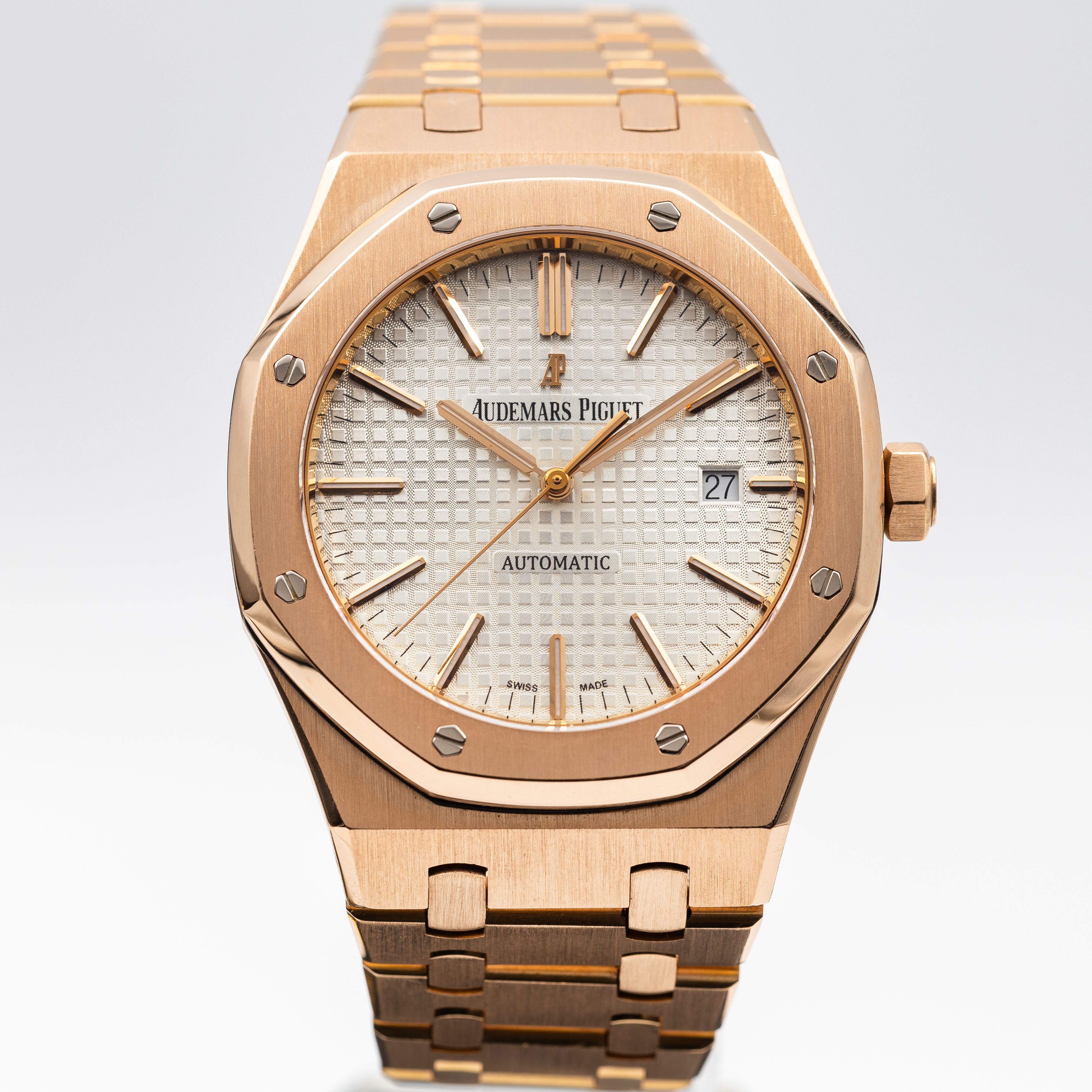 This Audemars Piguet Royal Oak 15400OR.OO.1220OR.02 has a silver baton dial and a bracelet strap. This Audemars Piguet has undergone a thorough inspection of accuracy, functionality and condition at our Audemars Piguet certified service centre to determine the level of reconditioning required to meet our strict standards. It has also been checked against our records to ensure authenticity. All our watches have a 24-month warranty for your peace of mind.