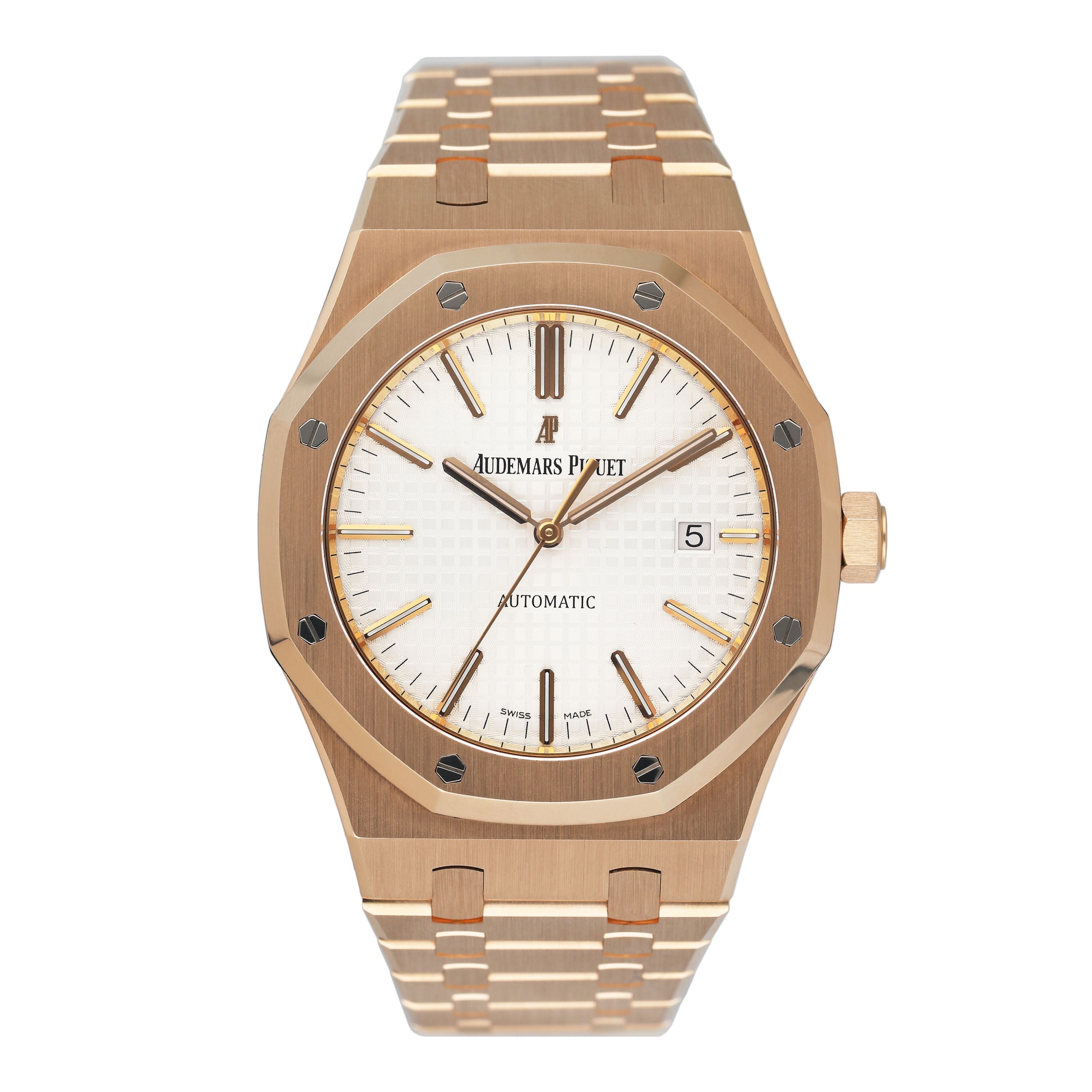 This Audemars Piguet Royal Oak 15400OR.OO.1220OR.02 has a silver baton dial and a bracelet strap. This Audemars Piguet has undergone a thorough inspection of accuracy, functionality and condition at our Audemars Piguet certified service centre to determine the level of reconditioning required to meet our strict standards. It has also been checked against our records to ensure authenticity. All our watches have a 24-month warranty for your peace of mind.