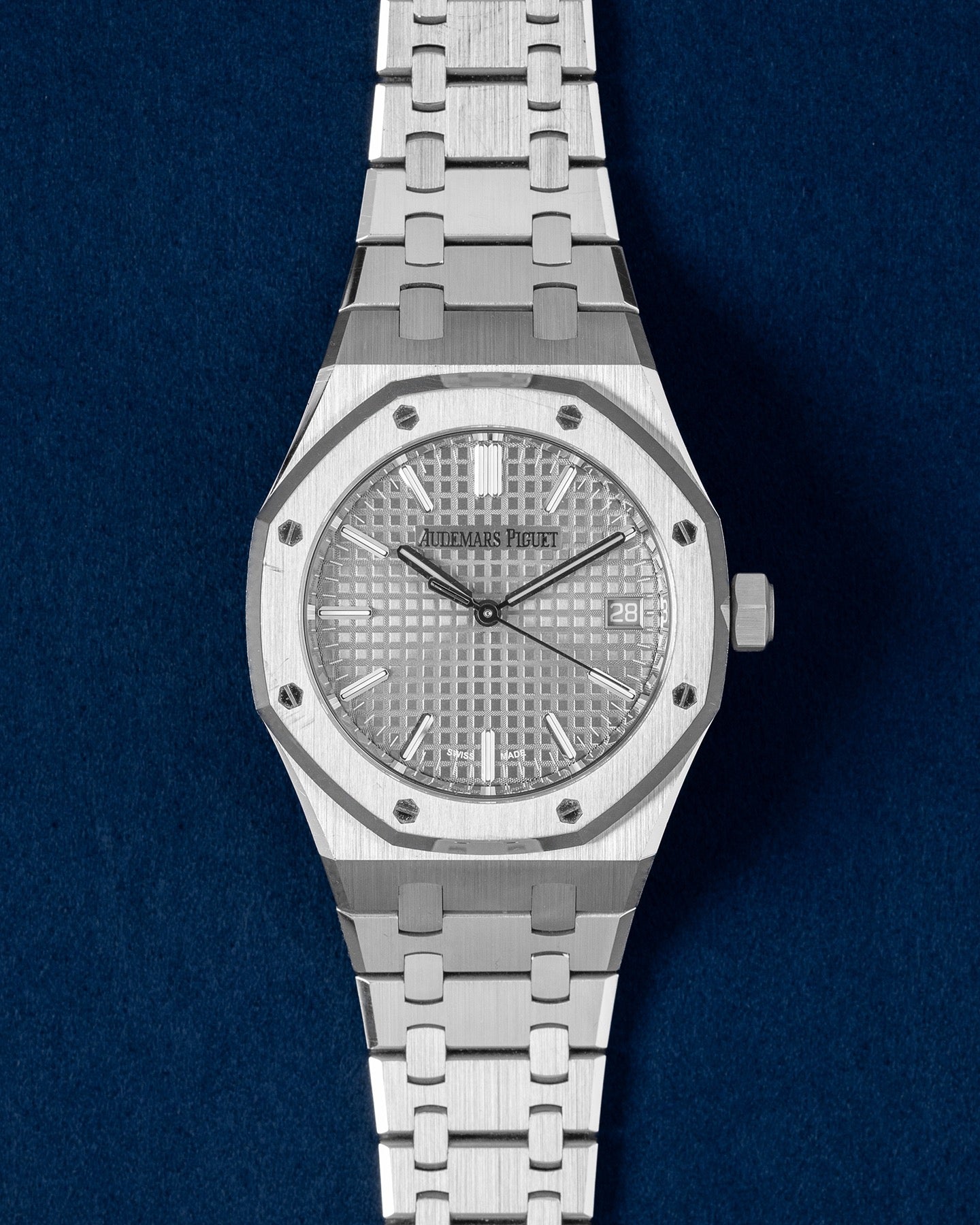 This Audemars Piguet Royal Oak 15550ST.OO.1356ST.07 has a grey baton dial and a bracelet strap. This Audemars Piguet has undergone a thorough inspection of accuracy, functionality and condition at our Audemars Piguet certified service centre to determine the level of reconditioning required to meet our strict standards. It has also been checked against our records to ensure authenticity. All our watches have a 24-month warranty for your peace of mind.