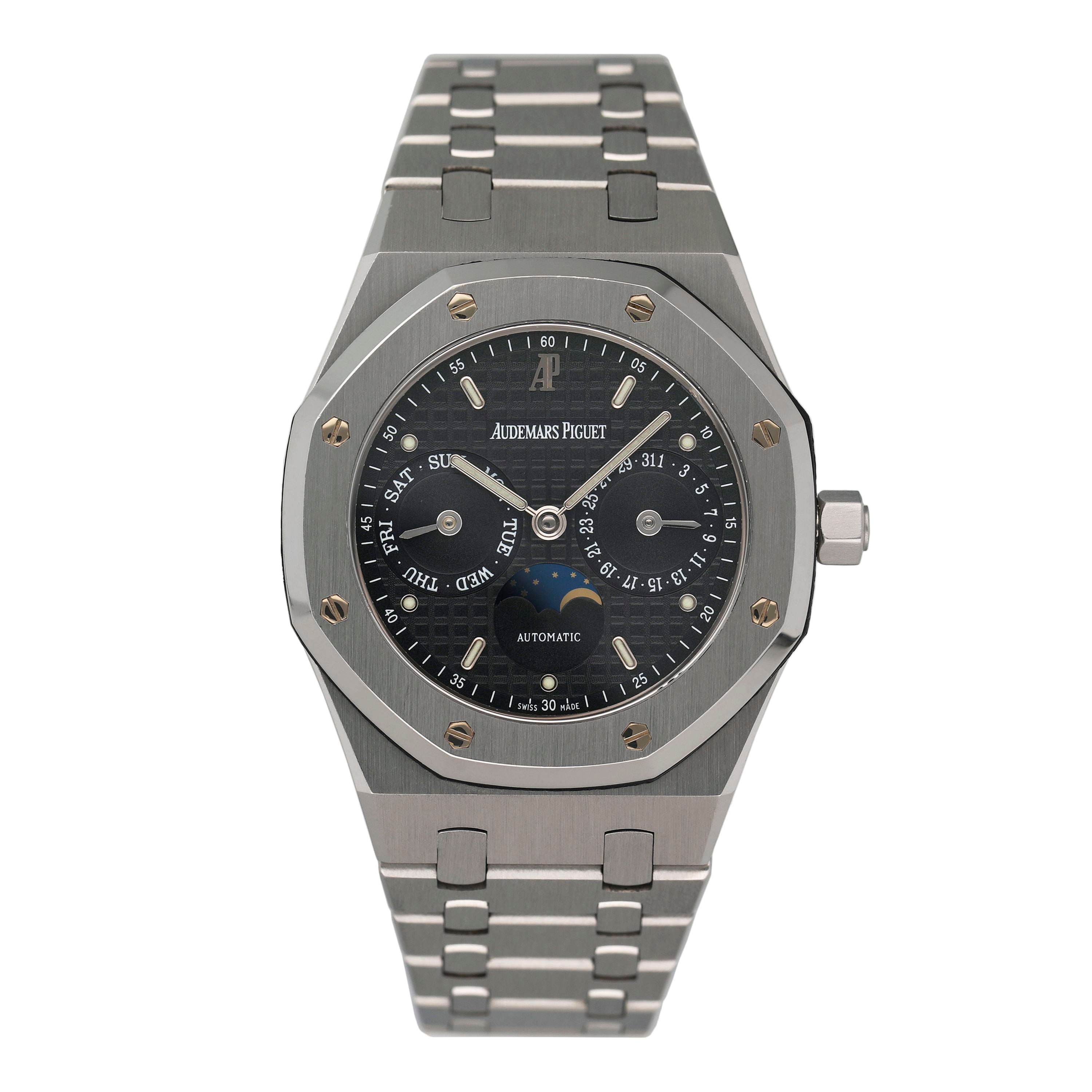 This Audemars Piguet Royal Oak 25594ST.OO.0789ST.04 has a blue dial and a bracelet strap. This Audemars Piguet has undergone a thorough inspection of accuracy, functionality and condition at our Audemars Piguet certified service centre to determine the level of reconditioning required to meet our strict standards. It has also been checked against our records to ensure authenticity. All our watches have a 24-month warranty for your peace of mind.