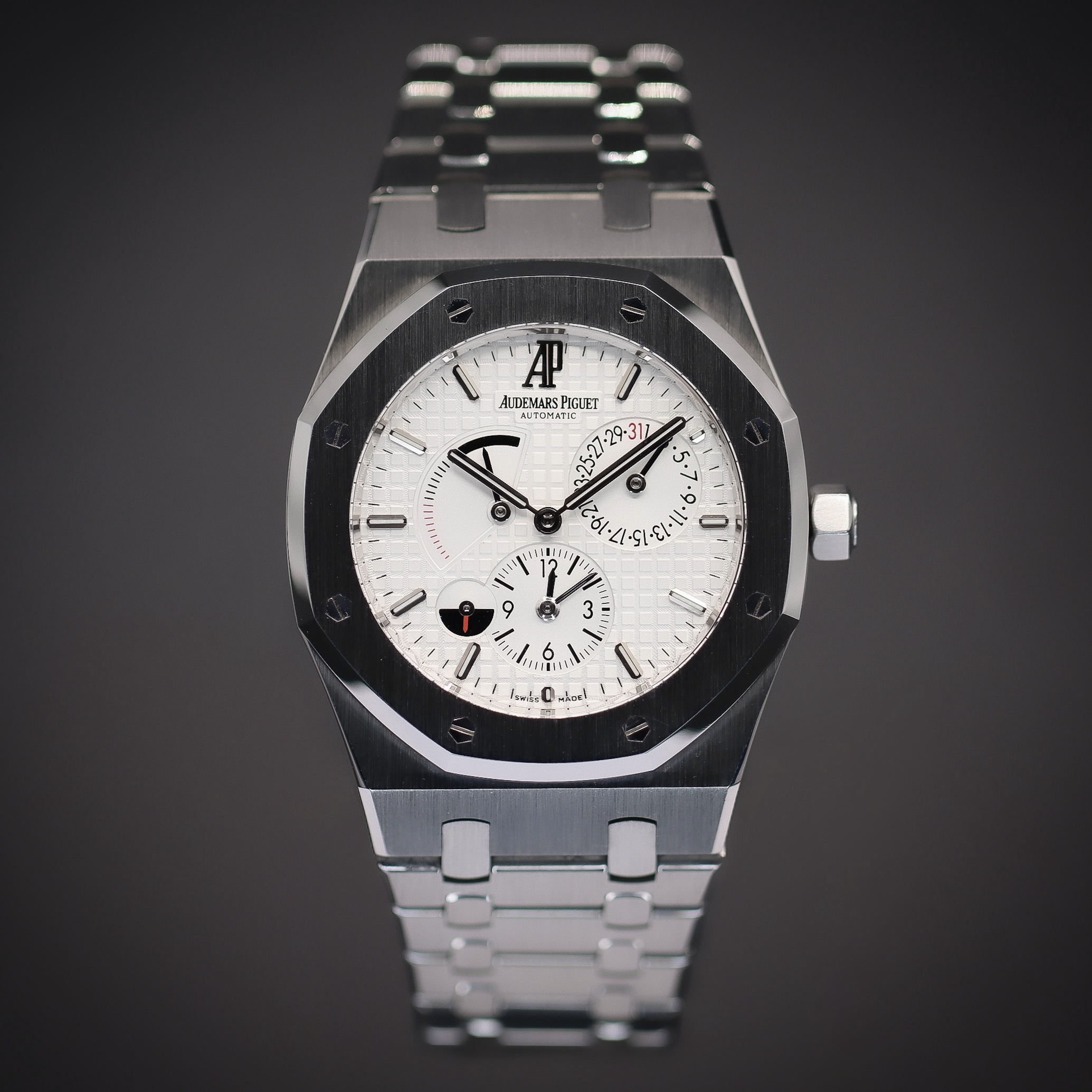 Audemars Piguet's legendary Royal Oak caused huge upset to the watch industry when it debuted at Baselworld 1972. A luxury watch – with luxury pricing to match – the Royal Oak had a steel case with an integrated bracelet, and an unprecedented octagonal design by the renowned Gerald Genta. It managed to be both sporty and utterly elegant. This breathtaking boldness was a risky strategy at the time, but it has proved an enduring classic that swiftly became the brand's most iconic and distinguished collection, embodying the prestige and manufacturing prowess associated with the name Audemars Piguet. This stunning example has been augmented with impressive new complications, including a retrograde power reserve display and a second time zone, with its own smaller 24-hour subdial.