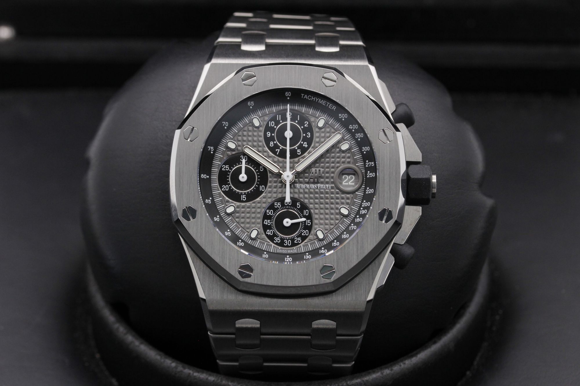 This Audemars Piguet Royal Oak 26238TI.OO.2000TI.01 has a grey dial and a bracelet strap. This Audemars Piguet has undergone a thorough inspection of accuracy, functionality and condition at our Audemars Piguet certified service centre to determine the level of reconditioning required to meet our strict standards. It has also been checked against our records to ensure authenticity. All our watches have a 24-month warranty for your peace of mind.