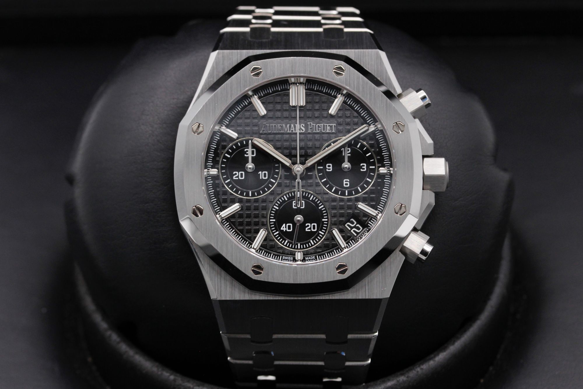 This Audemars Piguet Royal Oak 26240ST.OO.1320ST.02 has a black dial and a bracelet strap. This Audemars Piguet has undergone a thorough inspection of accuracy, functionality and condition at our Audemars Piguet certified service centre to determine the level of reconditioning required to meet our strict standards. It has also been checked against our records to ensure authenticity. All our watches have a 24-month warranty for your peace of mind.
