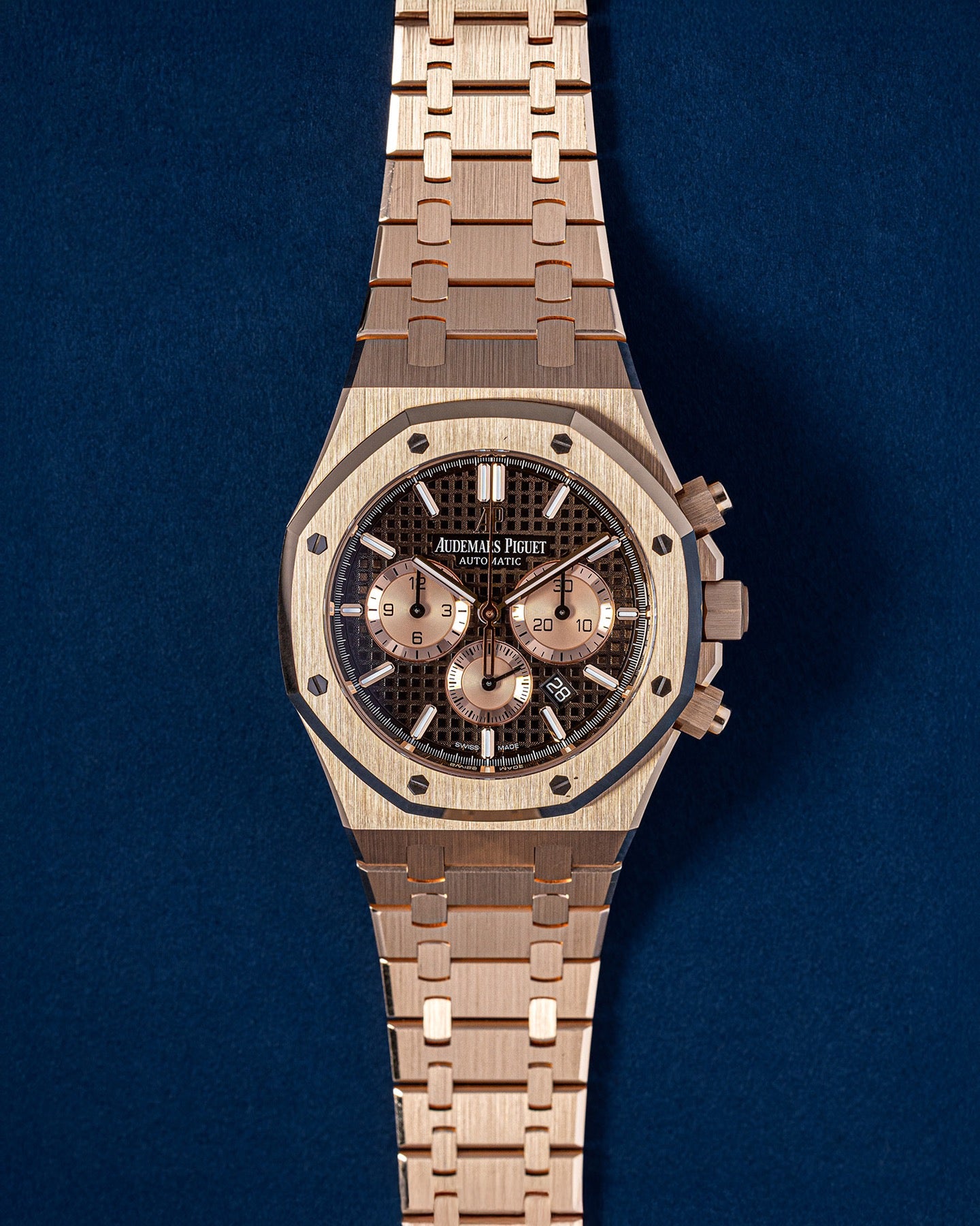 This Audemars Piguet Royal Oak 26331OR.OO.1220OR.02 has a brown baton dial and a bracelet strap. This Audemars Piguet has undergone a thorough inspection of accuracy, functionality and condition at our Audemars Piguet certified service centre to determine the level of reconditioning required to meet our strict standards. It has also been checked against our records to ensure authenticity. All our watches have a 24-month warranty for your peace of mind.