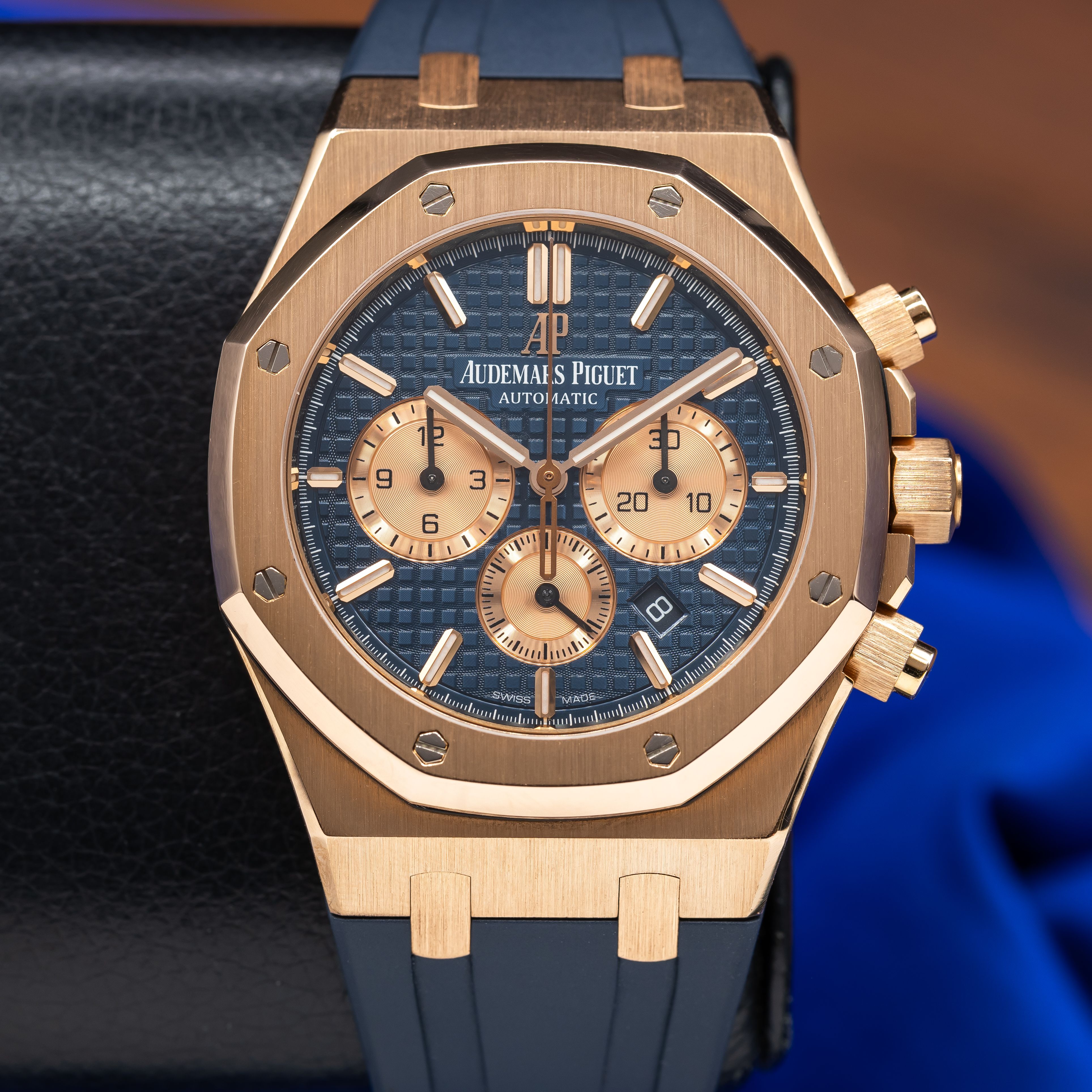 This Audemars Piguet Royal Oak 26331OR.OO.D315CR.01 has a blue baton dial and a rubber strap. This Audemars Piguet has undergone a thorough inspection of accuracy, functionality and condition at our Audemars Piguet certified service centre to determine the level of reconditioning required to meet our strict standards. It has also been checked against our records to ensure authenticity. All our watches have a 24-month warranty for your peace of mind.