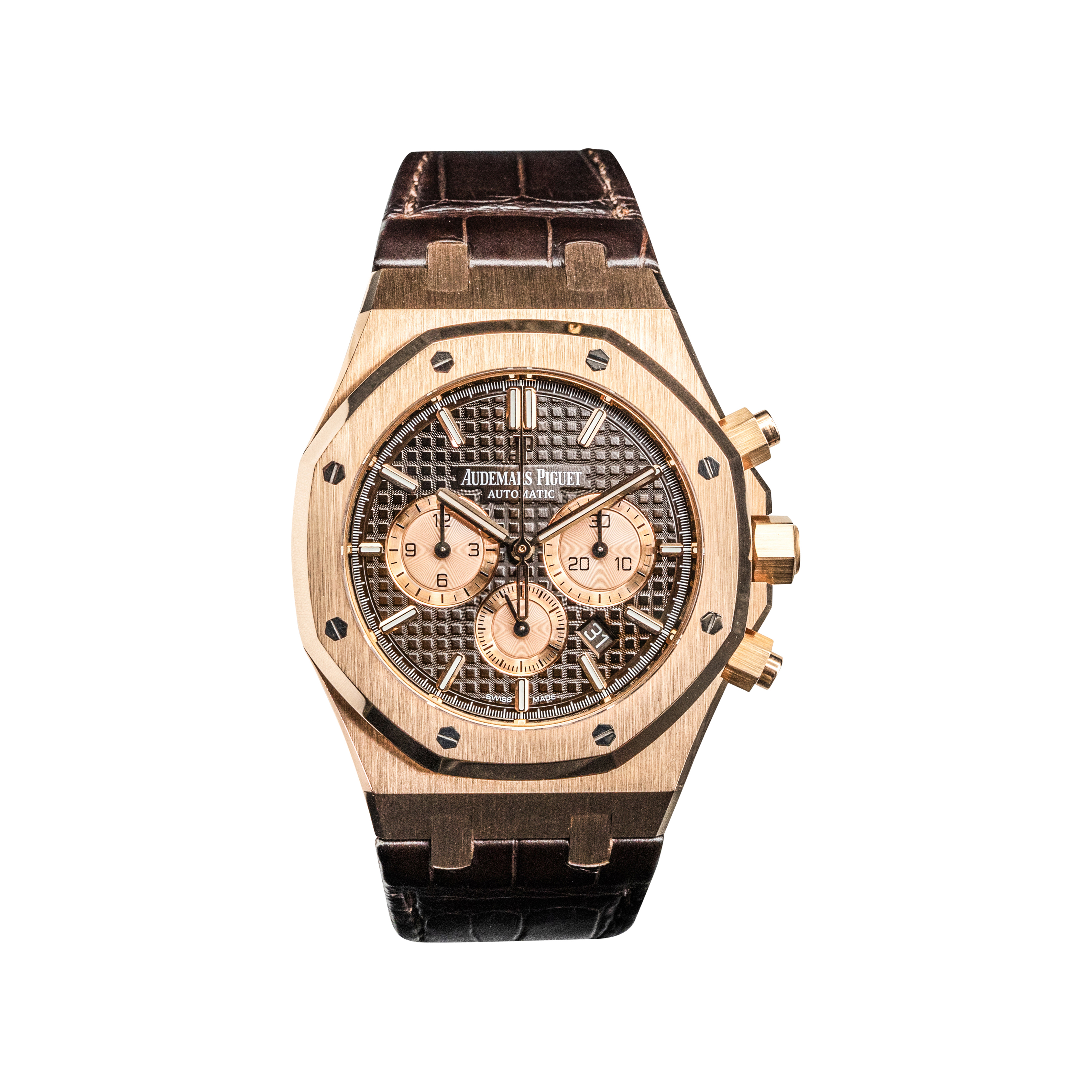 This Audemars Piguet Royal Oak 26331OR.OO.D821CR.01 has a brown baton dial and a leather strap. This Audemars Piguet has undergone a thorough inspection of accuracy, functionality and condition at our Audemars Piguet certified service centre to determine the level of reconditioning required to meet our strict standards. It has also been checked against our records to ensure authenticity. All our watches have a 24-month warranty for your peace of mind.