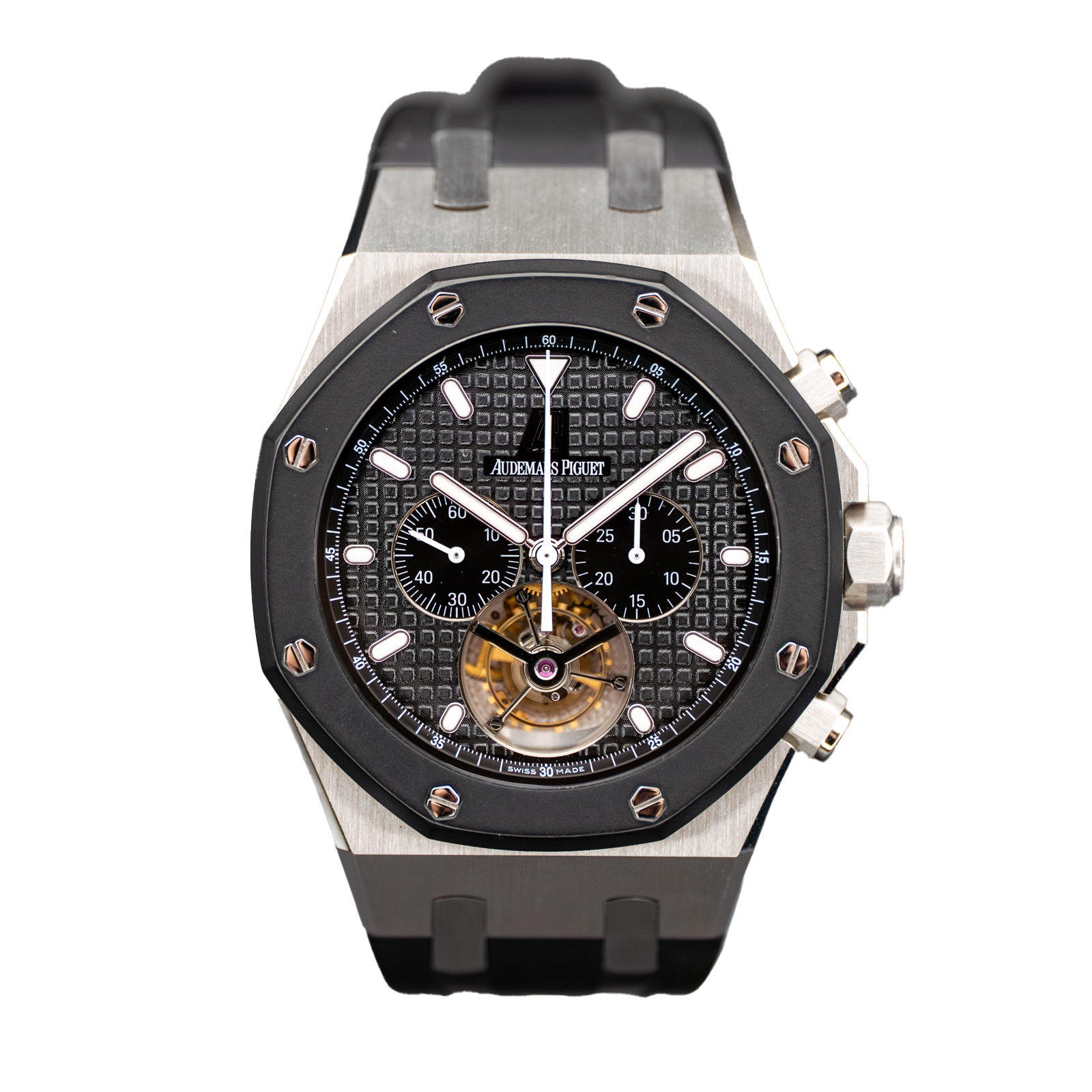 This Audemars Piguet Royal Oak 26377SK.OO.D002CA.01 has a black baton dial and a rubber strap. This Audemars Piguet has undergone a thorough inspection of accuracy, functionality and condition at our Audemars Piguet certified service centre to determine the level of reconditioning required to meet our strict standards. It has also been checked against our records to ensure authenticity. All our watches have a 24-month warranty for your peace of mind.