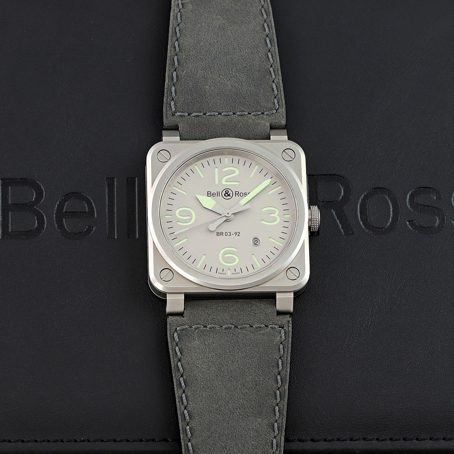 This Bell and Ross BR03-92 BR0392-GR-ST/SCA has a grey quarter arabic dial and a fabric strap. This Bell and Ross has undergone a thorough inspection of water resistance, accuracy, functionality and condition to determine the level of reconditioning required to meet our strict standards. It has also been referenced against technical documents and manufacturer records where available to ensure authenticity and a clean history. All our watches have a 24-month warranty for your peace of mind.