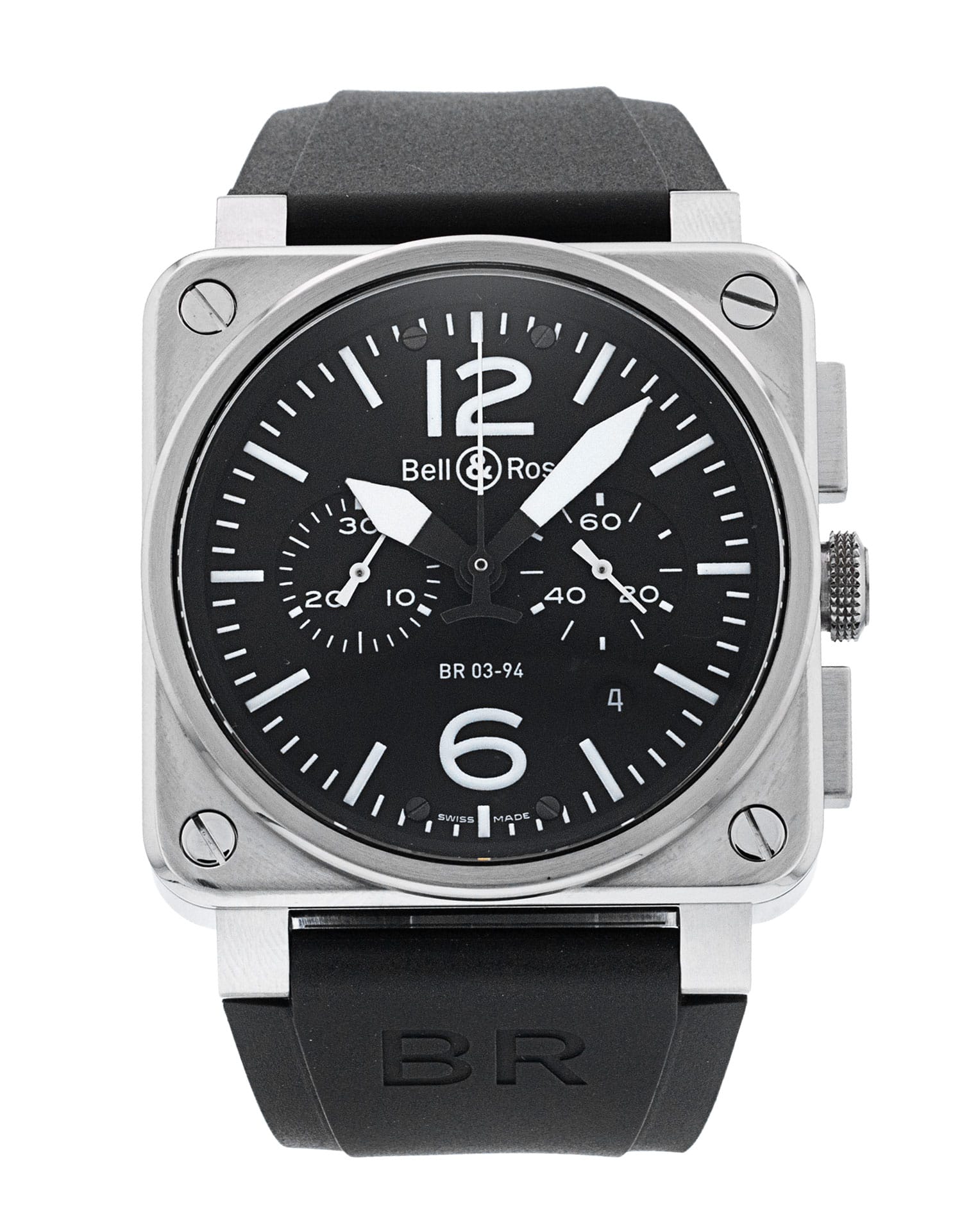 This Bell and Ross BR03-94 Chronograph BR03-94 has a black dial and a rubber strap. This Bell and Ross has undergone a thorough inspection of water resistance, accuracy, functionality and condition to determine the level of reconditioning required to meet our strict standards. It has also been referenced against technical documents and manufacturer records where available to ensure authenticity and a clean history. All our watches have a 24-month warranty for your peace of mind.