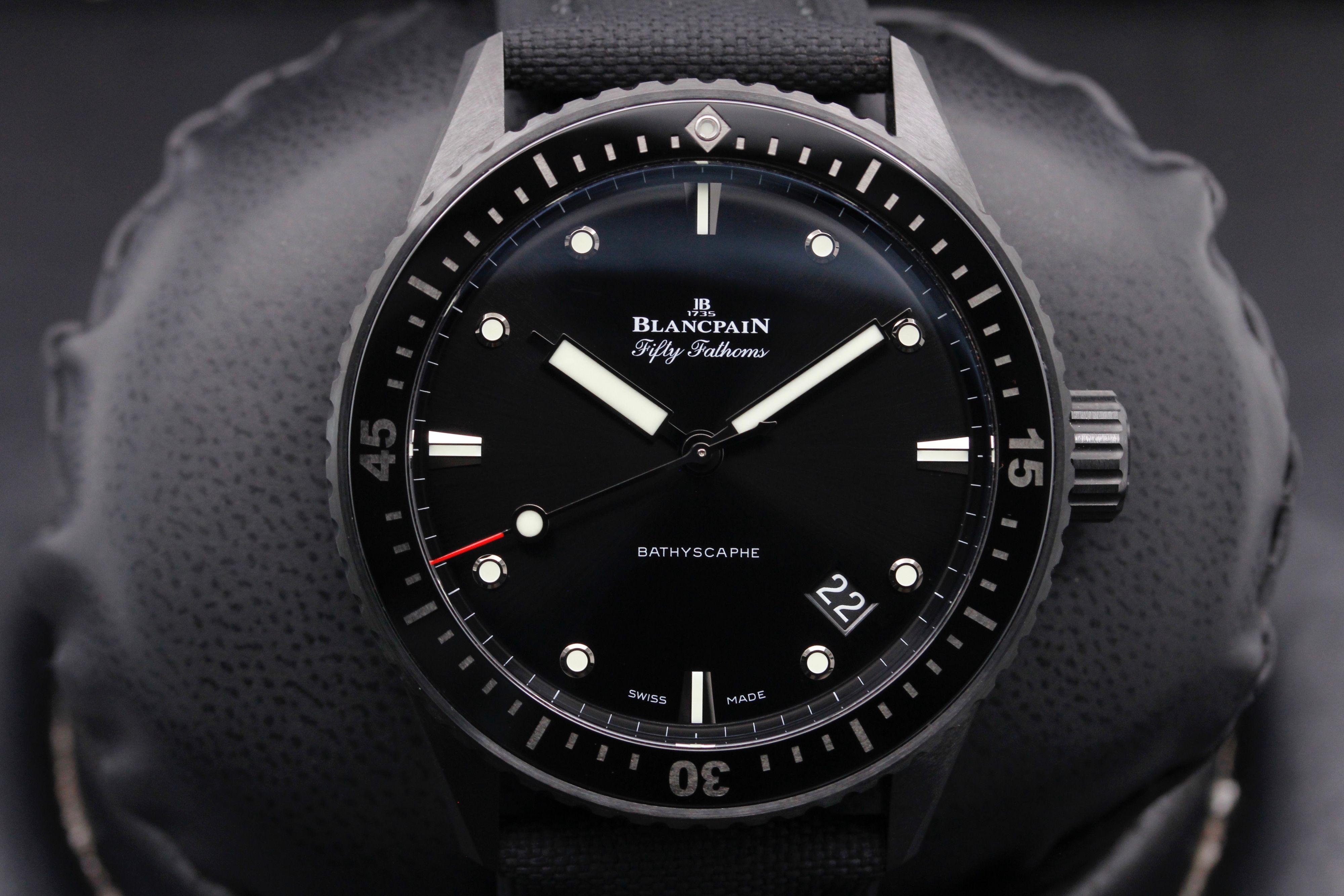 This Blancpain Fifty Fathoms 5000-0130-B52A has a black dial and a fabric strap. This Blancpain has undergone a thorough inspection of water resistance, accuracy, functionality and condition to determine the level of reconditioning required to meet our strict standards. It has also been referenced against technical documents and manufacturer records where available to ensure authenticity and a clean history. All our watches have a 24-month warranty for your peace of mind.