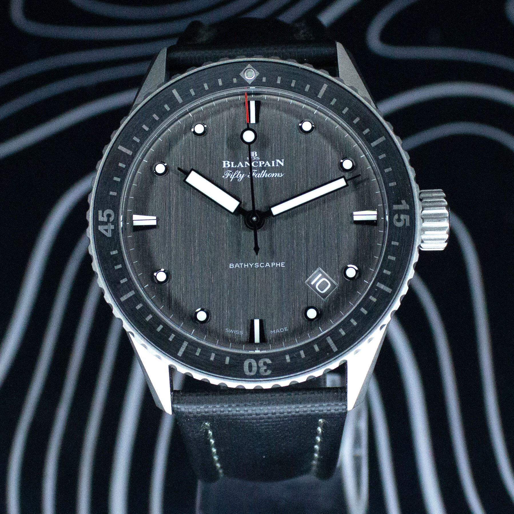 This Blancpain Fifty Fathoms 5000-1210-NAGA has a grey dial and a leather strap. This Blancpain has undergone a thorough inspection of water resistance, accuracy, functionality and condition to determine the level of reconditioning required to meet our strict standards. It has also been referenced against technical documents and manufacturer records where available to ensure authenticity and a clean history. All our watches have a 24-month warranty for your peace of mind.