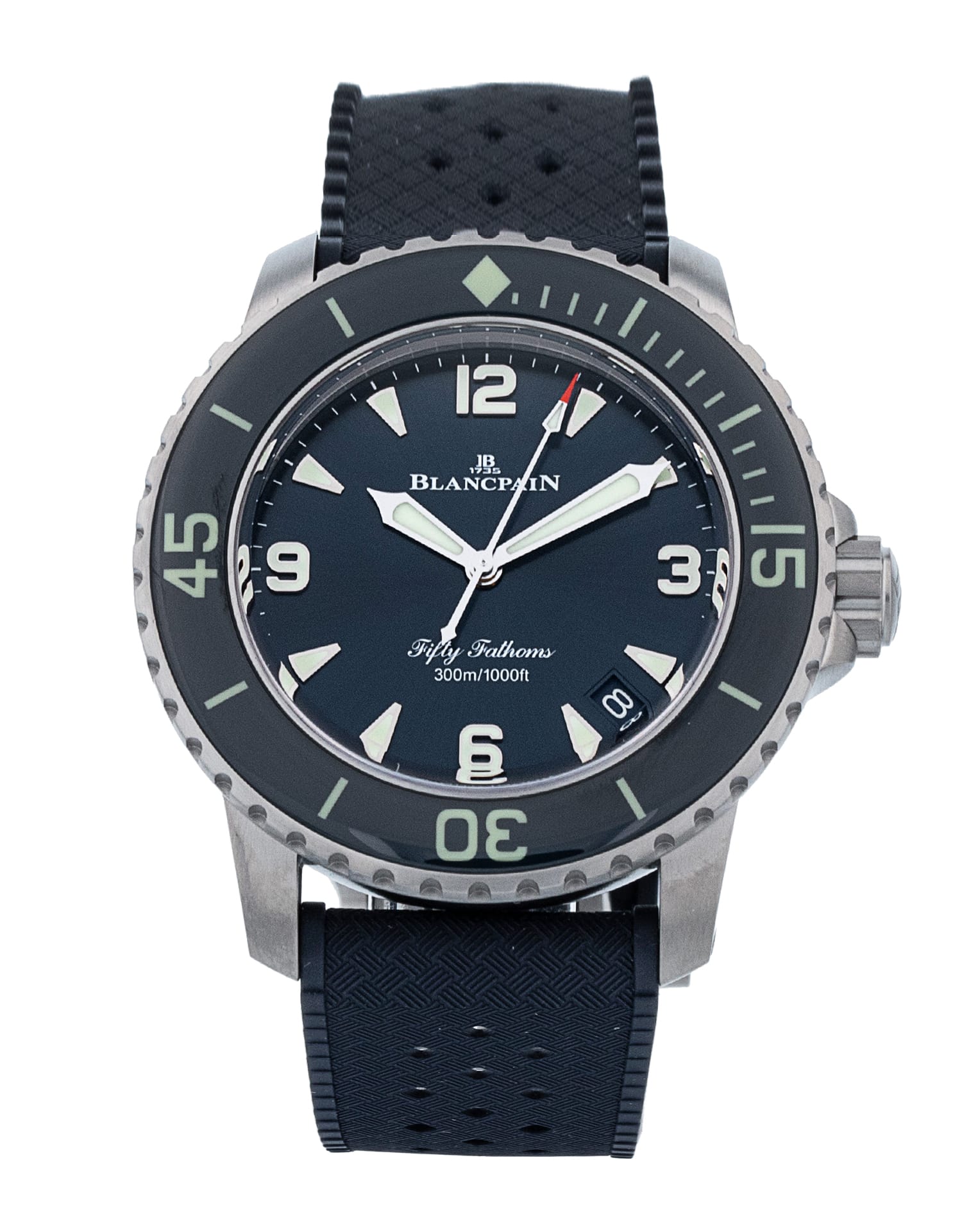 This Blancpain Fifty Fathoms 5010-12B40-O64A has a blue quarter arabic dial and a rubber strap. This Blancpain has undergone a thorough inspection of water resistance, accuracy, functionality and condition to determine the level of reconditioning required to meet our strict standards. It has also been referenced against technical documents and manufacturer records where available to ensure authenticity and a clean history. All our watches have a 24-month warranty for your peace of mind.