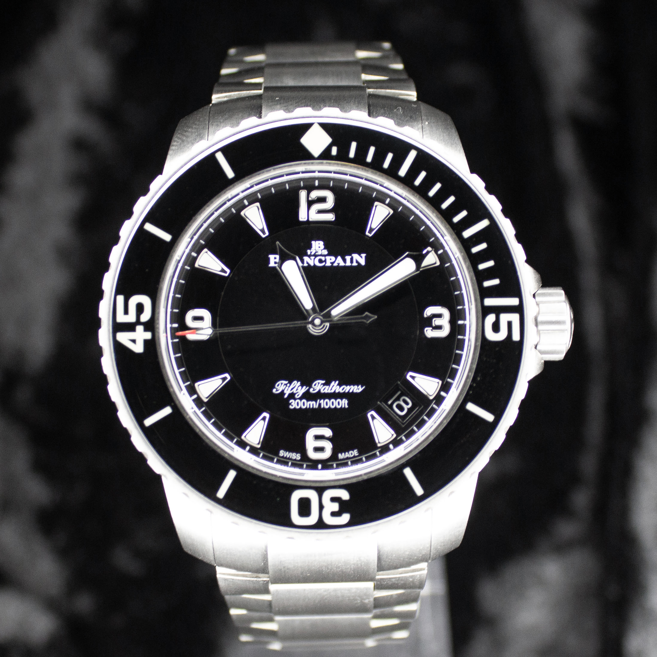 This Blancpain Fifty Fathoms 5015-12B30-98B has a black quarter arabic dial and a bracelet strap. This Blancpain has undergone a thorough inspection of water resistance, accuracy, functionality and condition to determine the level of reconditioning required to meet our strict standards. It has also been referenced against technical documents and manufacturer records where available to ensure authenticity and a clean history. All our watches have a 24-month warranty for your peace of mind.