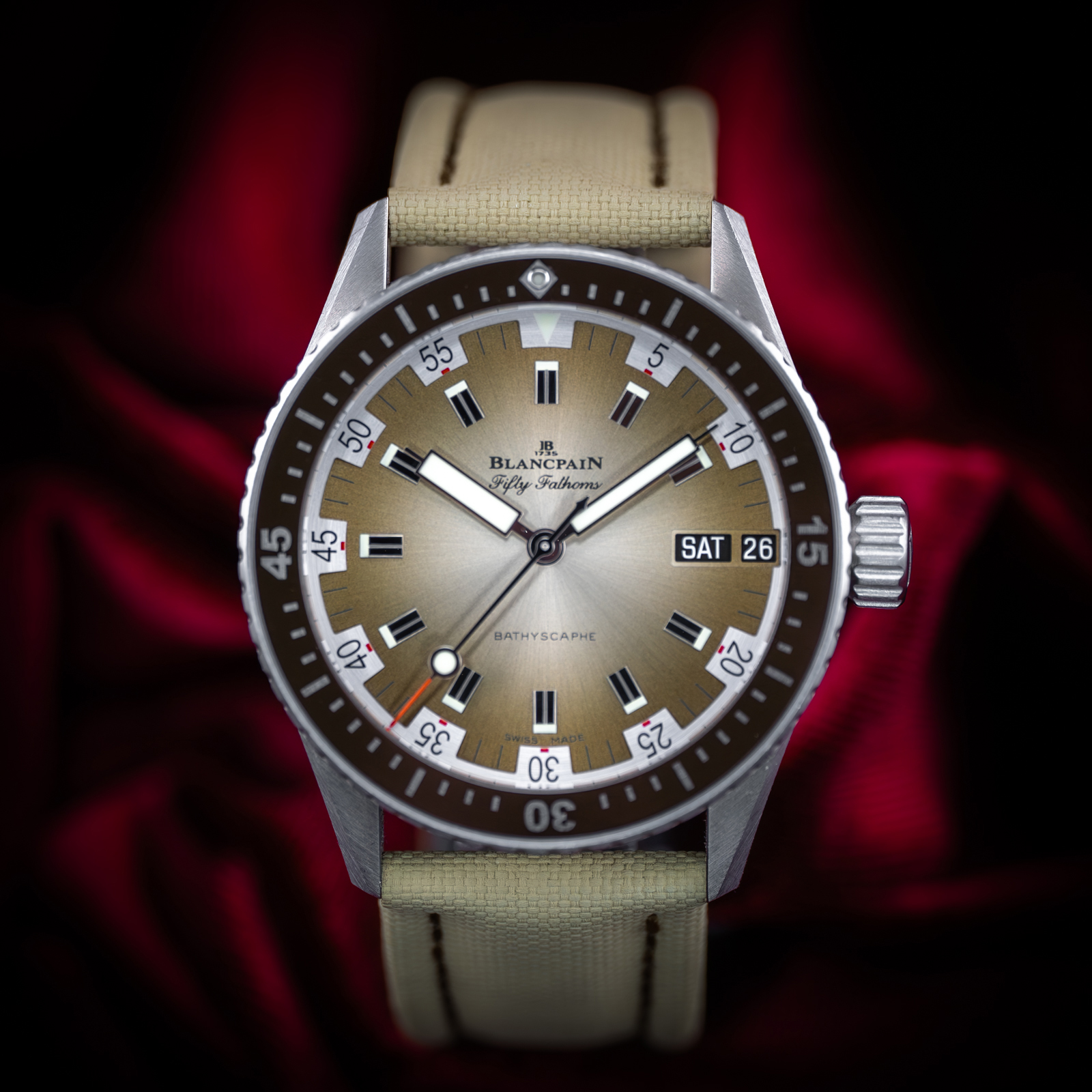 This Blancpain Fifty Fathoms 5052-1146-E52A has a brown baton dial and a fabric strap. This Blancpain has undergone a thorough inspection of water resistance, accuracy, functionality and condition to determine the level of reconditioning required to meet our strict standards. It has also been referenced against technical documents and manufacturer records where available to ensure authenticity and a clean history. All our watches have a 24-month warranty for your peace of mind.