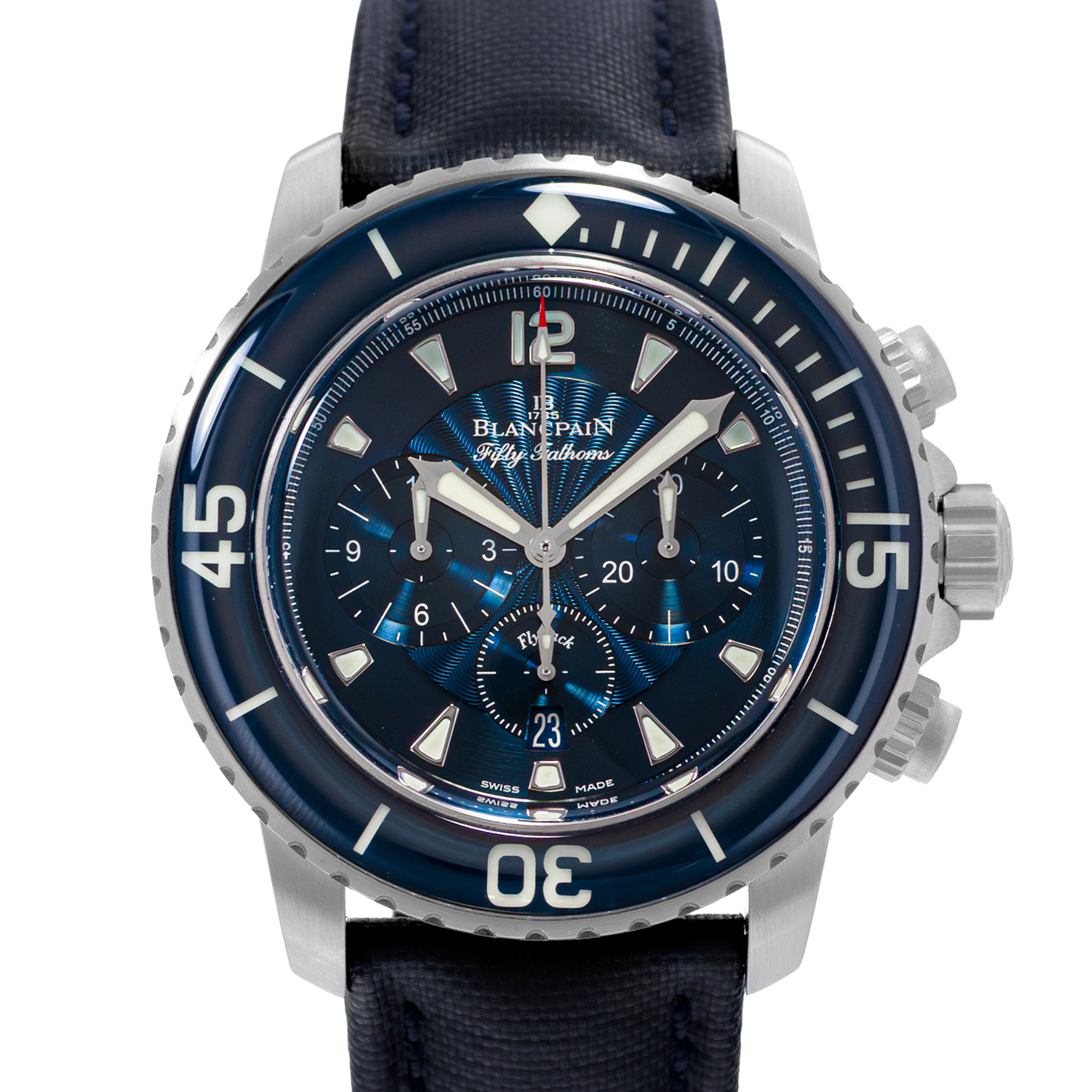 This Blancpain Fifty Fathoms 5085FB-1140-52B has a blue baton dial and a fabric strap. This Blancpain has undergone a thorough inspection of water resistance, accuracy, functionality and condition to determine the level of reconditioning required to meet our strict standards. It has also been referenced against technical documents and manufacturer records where available to ensure authenticity and a clean history. All our watches have a 24-month warranty for your peace of mind.