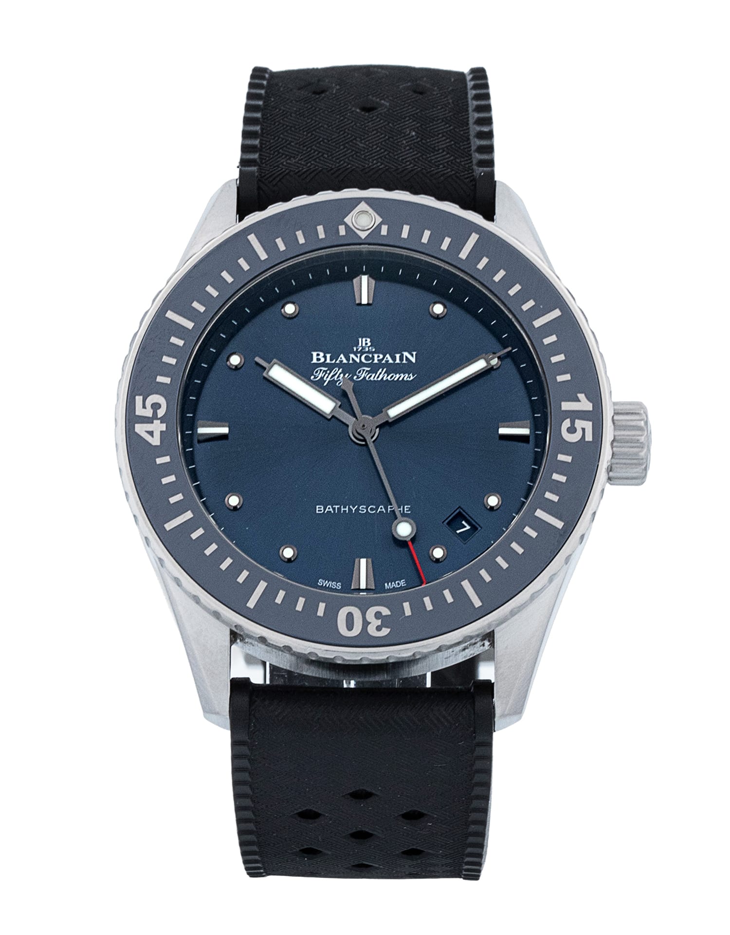 This Blancpain Fifty Fathoms 5100-1140-O52A has a blue dial and a rubber strap. This Blancpain has undergone a thorough inspection of water resistance, accuracy, functionality and condition to determine the level of reconditioning required to meet our strict standards. It has also been referenced against technical documents and manufacturer records where available to ensure authenticity and a clean history. All our watches have a 24-month warranty for your peace of mind.
