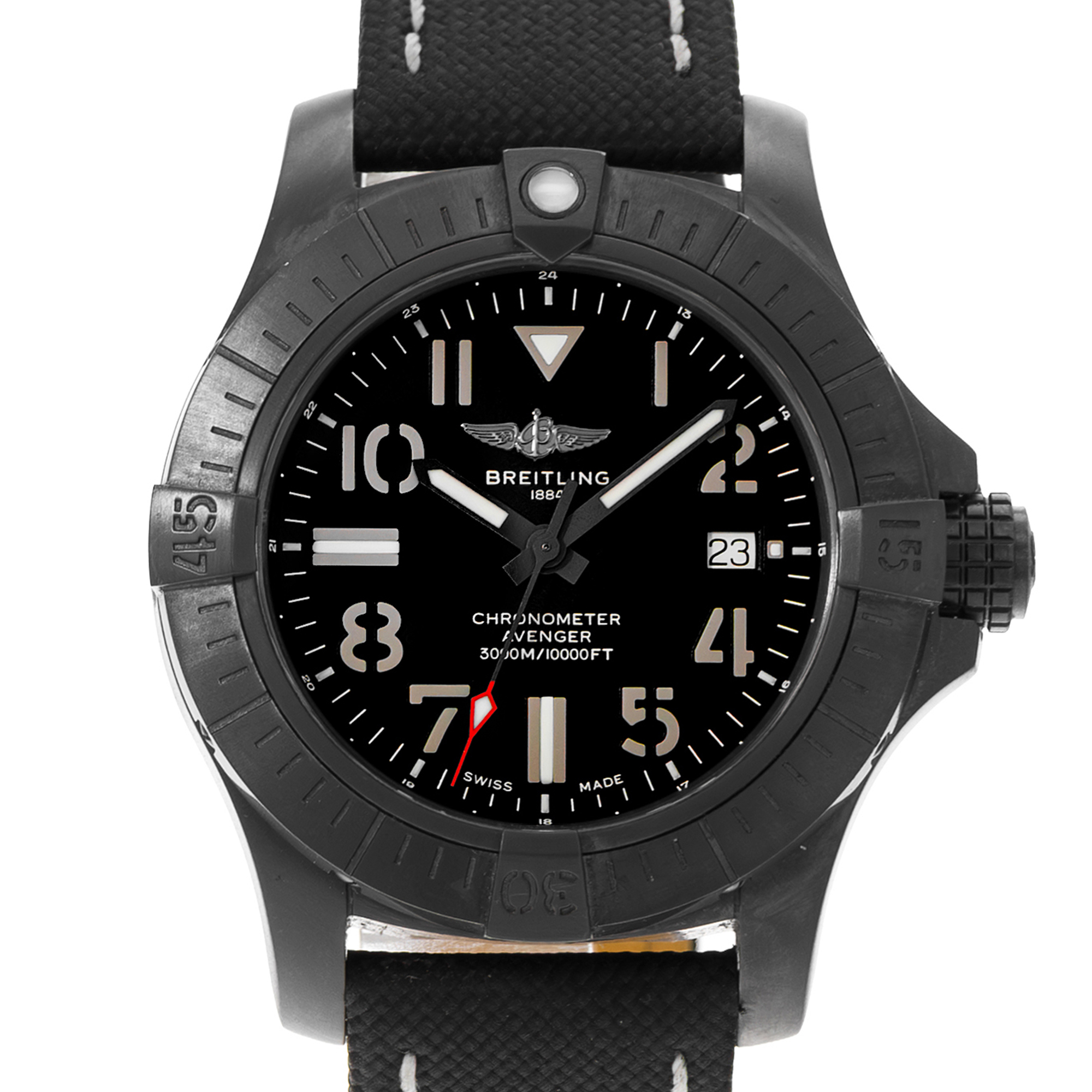 This Breitling Avenger Automatic 45 V17319 has a black arabic dial and a leather strap. This Breitling has undergone a thorough inspection of water resistance, accuracy, functionality and condition to determine the level of reconditioning required to meet our strict standards. It has also been referenced against technical documents and manufacturer records where available to ensure authenticity and a clean history. Our watches have a 24-month warranty for your peace of mind, in conjunction with any remaining manufacturer’s warranty from new or from service.