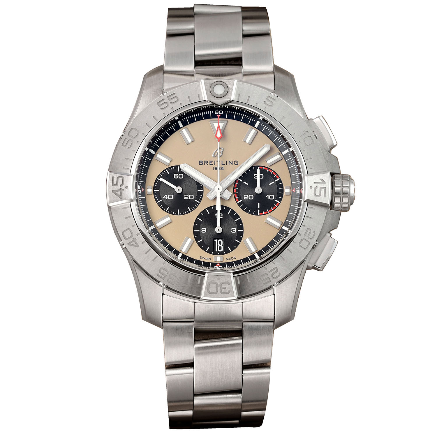 This Breitling Avenger B01 Chronograph AB0147 has a beige dial and a bracelet strap. This Breitling has undergone a thorough inspection of water resistance, accuracy, functionality and condition to determine the level of reconditioning required to meet our strict standards. It has also been referenced against technical documents and manufacturer records where available to ensure authenticity and a clean history. Our watches have a 24-month warranty for your peace of mind, in conjunction with any remaining manufacturer’s warranty from new or from service.