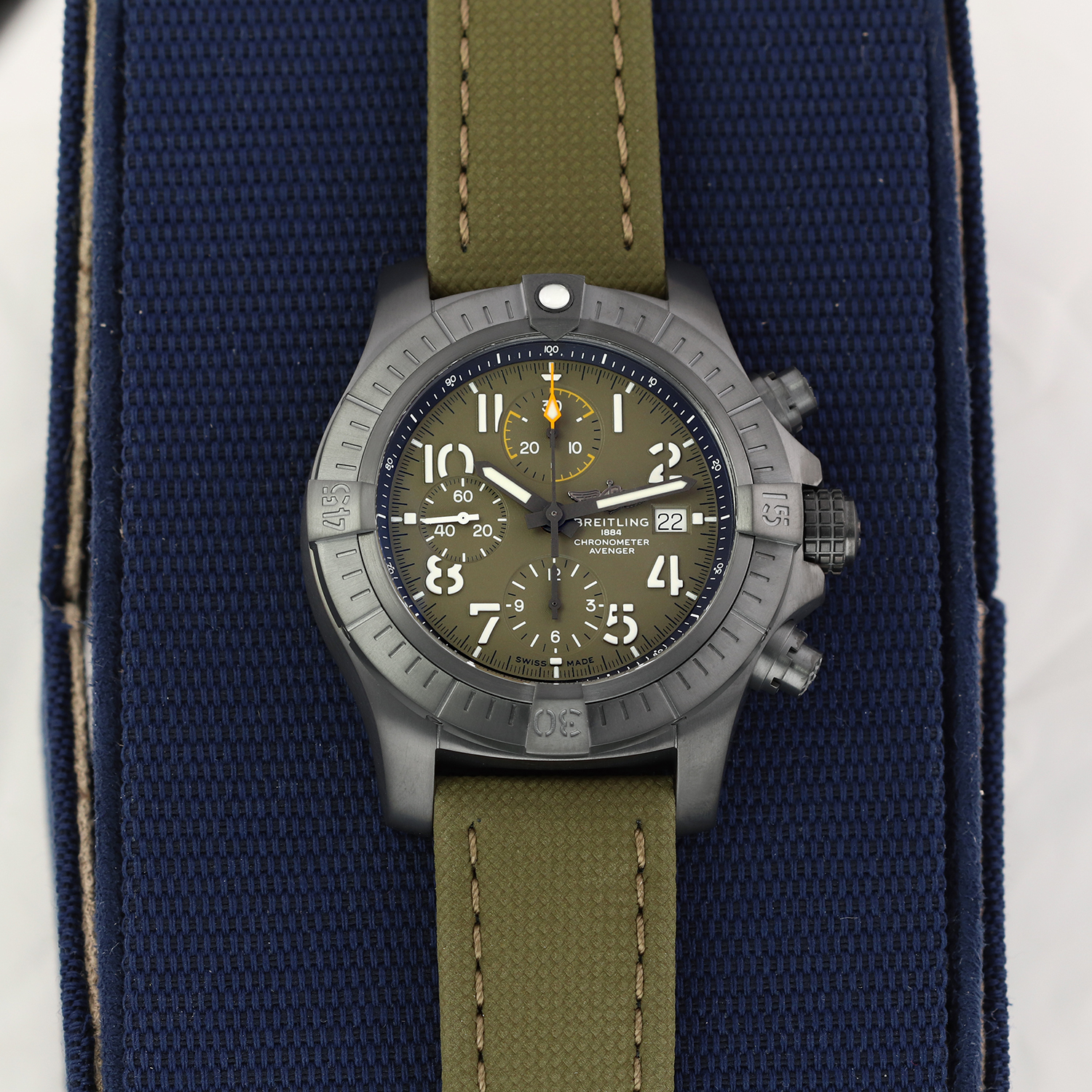 This Breitling Avenger Chronograph 45 Night Mission V13317 has a green arabic dial and a fabric strap. This Breitling has undergone a thorough inspection of water resistance, accuracy, functionality and condition to determine the level of reconditioning required to meet our strict standards. It has also been referenced against technical documents and manufacturer records where available to ensure authenticity and a clean history. Our watches have a 24-month warranty for your peace of mind, in conjunction with any remaining manufacturer’s warranty from new or from service.