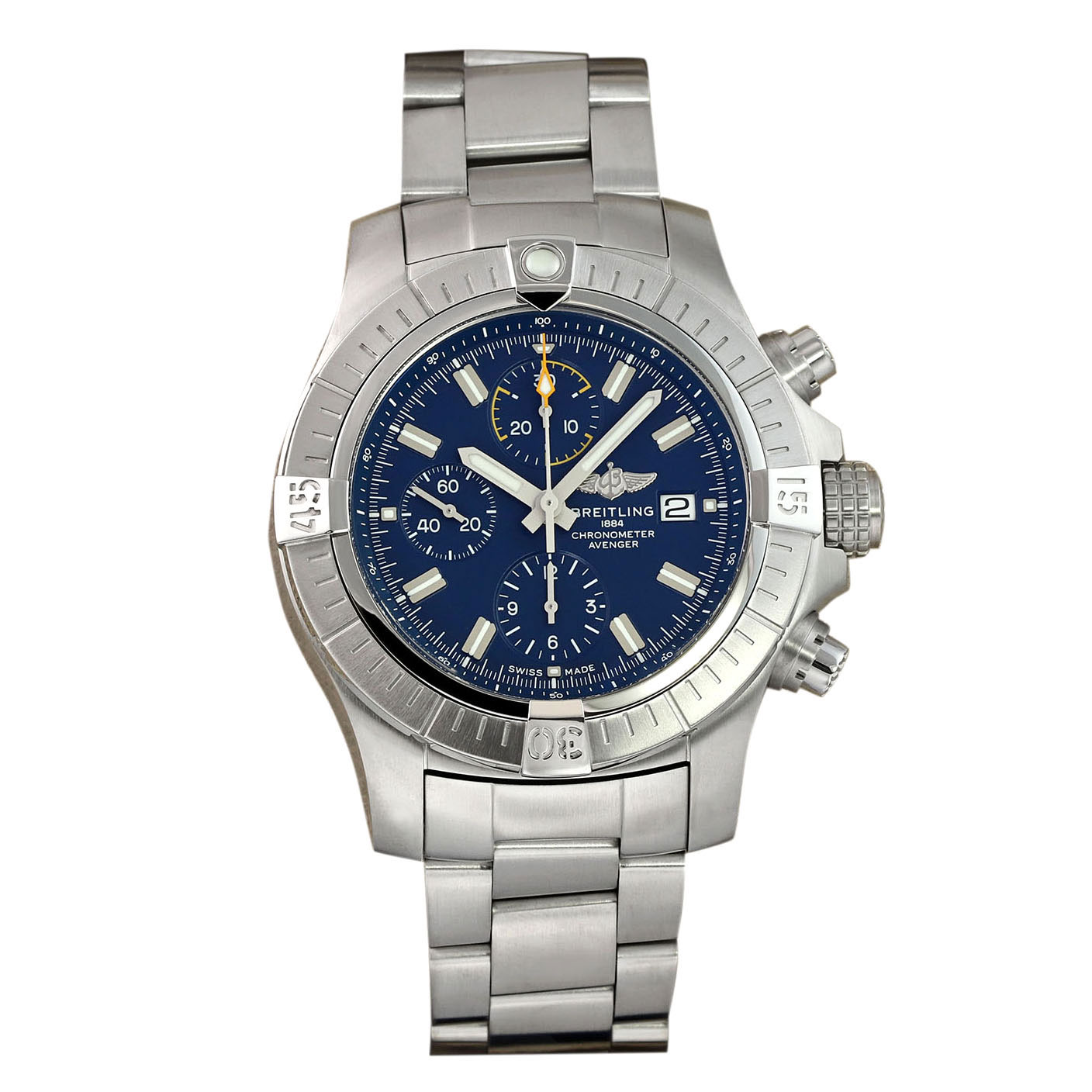 This Breitling Avenger Chronograph 45 A13317 has a blue baton dial and a bracelet strap. This Breitling has undergone a thorough inspection of water resistance, accuracy, functionality and condition to determine the level of reconditioning required to meet our strict standards. It has also been referenced against technical documents and manufacturer records where available to ensure authenticity and a clean history. All our watches have a 24-month warranty for your peace of mind.