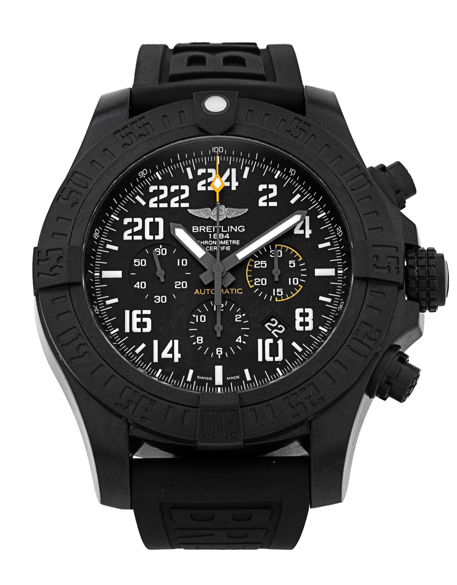 This Breitling Avenger Hurricane XB1210 has a black arabic dial and a rubber strap. This Breitling has undergone a thorough inspection of water resistance, accuracy, functionality and condition to determine the level of reconditioning required to meet our strict standards. It has also been referenced against technical documents and manufacturer records where available to ensure authenticity and a clean history. All our watches have a 24-month warranty for your peace of mind.