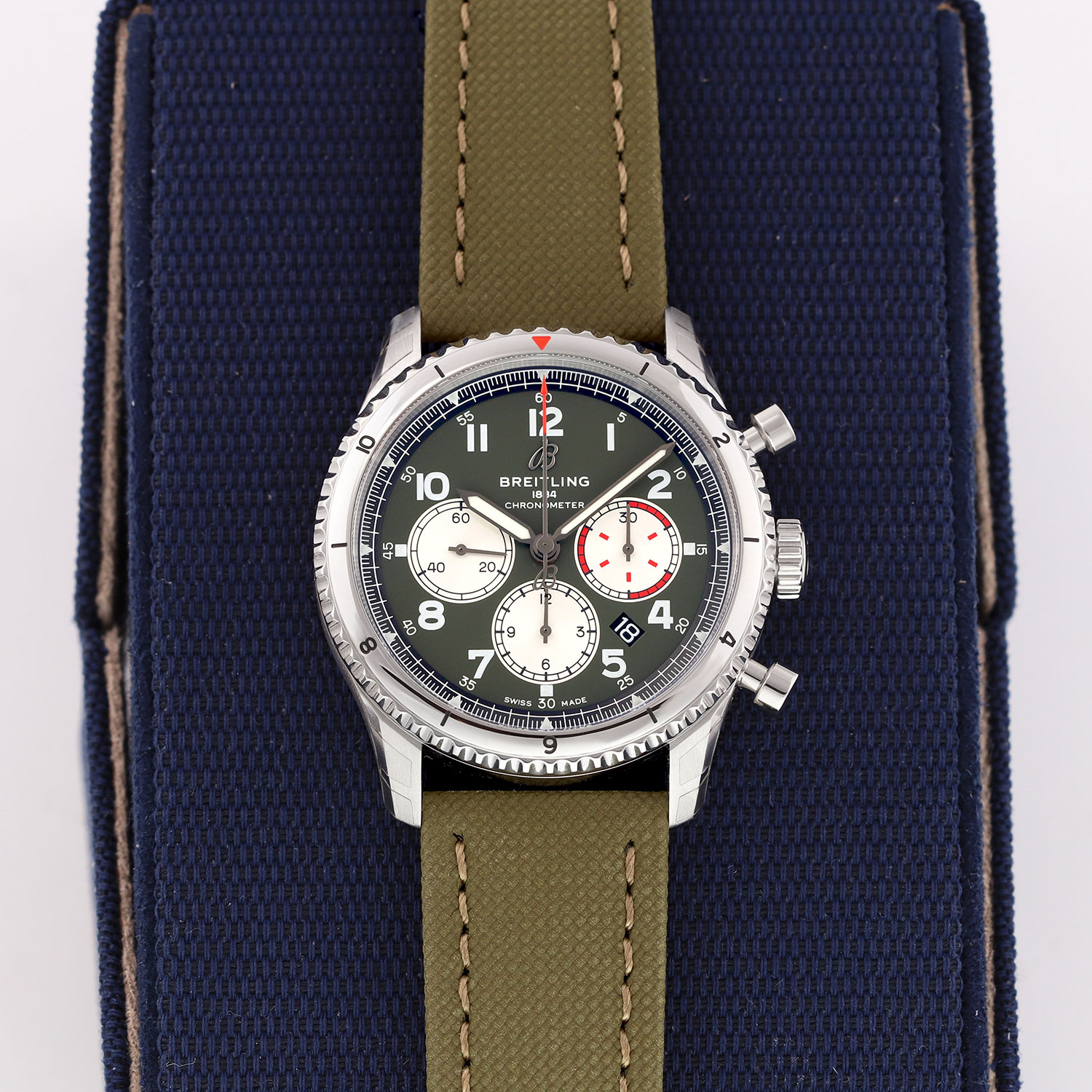 This Breitling Aviator 8 AB0119 has a green arabic dial and a fabric strap. This Breitling has undergone a thorough inspection of water resistance, accuracy, functionality and condition to determine the level of reconditioning required to meet our strict standards. It has also been referenced against technical documents and manufacturer records where available to ensure authenticity and a clean history. All our watches have a 24-month warranty for your peace of mind.