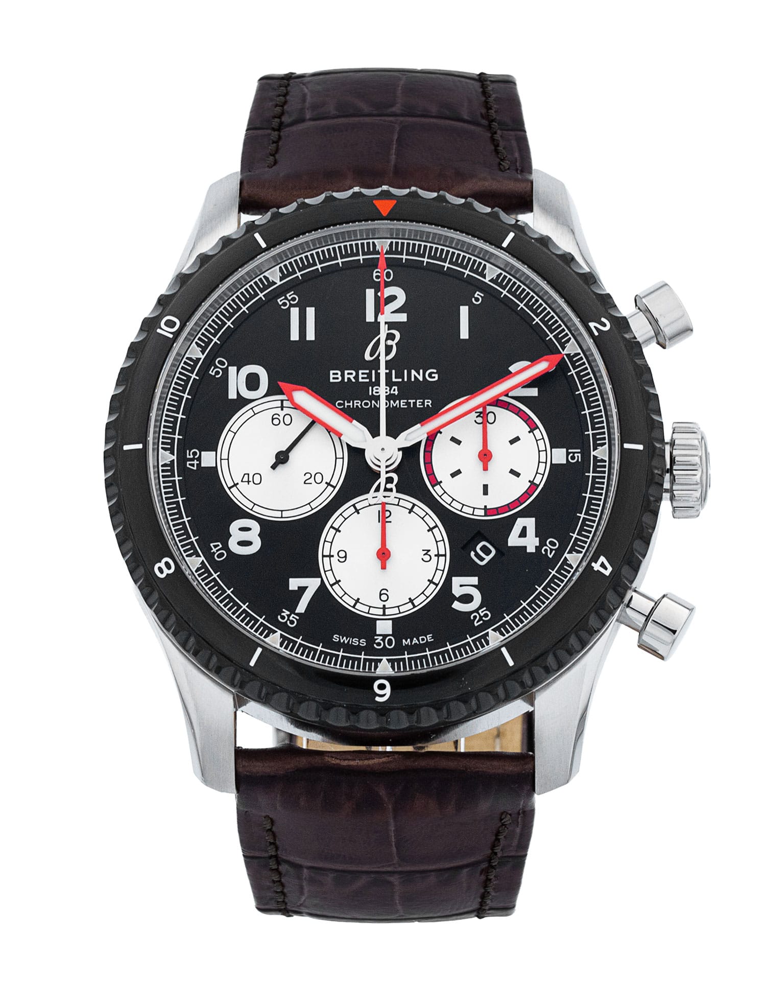 This Breitling Aviator 8 AB0119 has a black arabic dial and a leather strap. This Breitling has undergone a thorough inspection of water resistance, accuracy, functionality and condition to determine the level of reconditioning required to meet our strict standards. It has also been referenced against technical documents and manufacturer records where available to ensure authenticity and a clean history. Our watches have a 24-month warranty for your peace of mind, in conjunction with any remaining manufacturer’s warranty from new or from service.