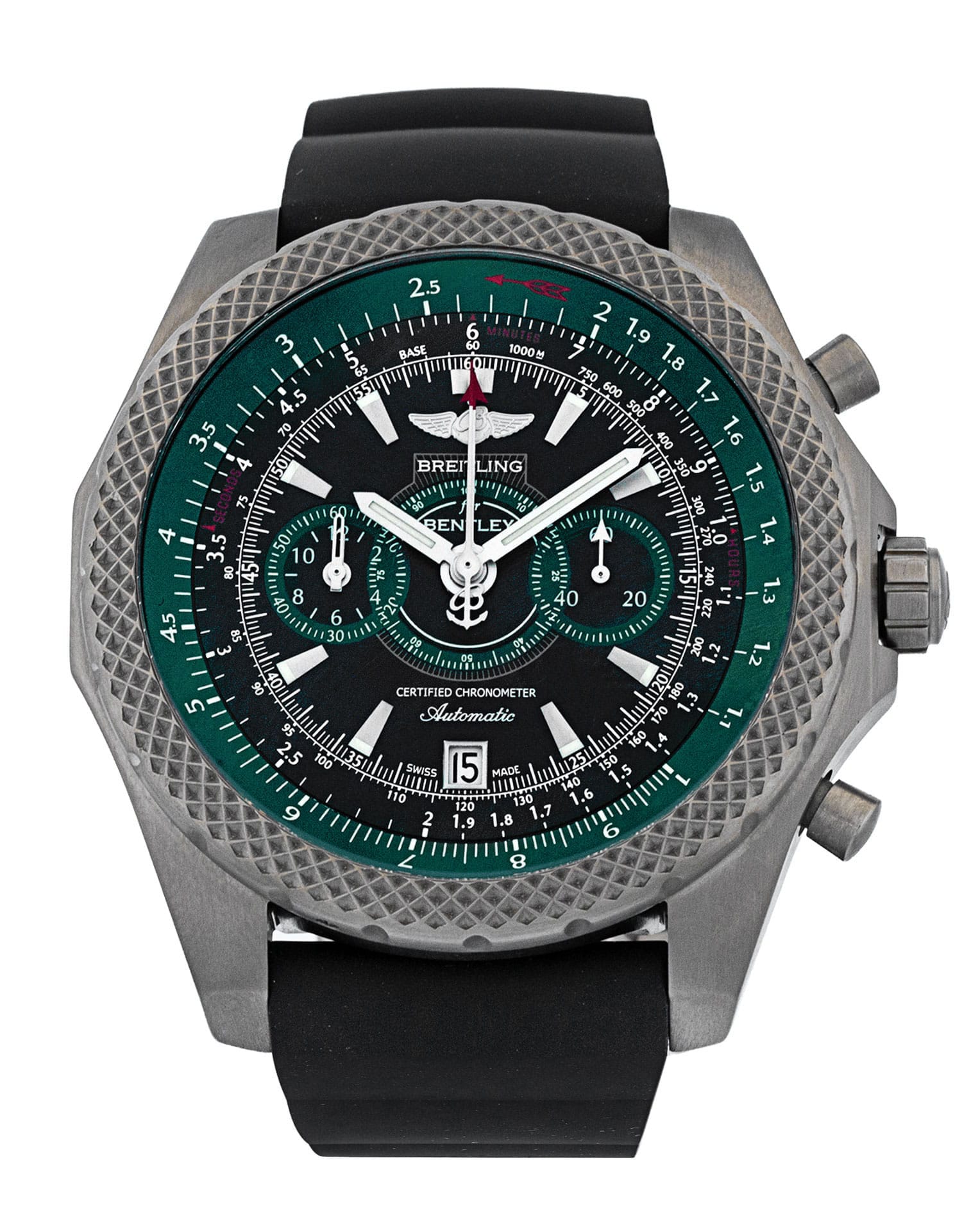 This Breitling Bentley Supersports E27365 has a black & green dial and a rubber strap. This Breitling has undergone a thorough inspection of water resistance, accuracy, functionality and condition to determine the level of reconditioning required to meet our strict standards. It has also been referenced against technical documents and manufacturer records where available to ensure authenticity and a clean history. All our watches have a 24-month warranty for your peace of mind.